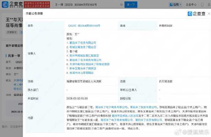 王一博起诉莆田鞋据企查查信息,王一博与多个莆田鞋商家肖像权纠纷将于9月开庭。据