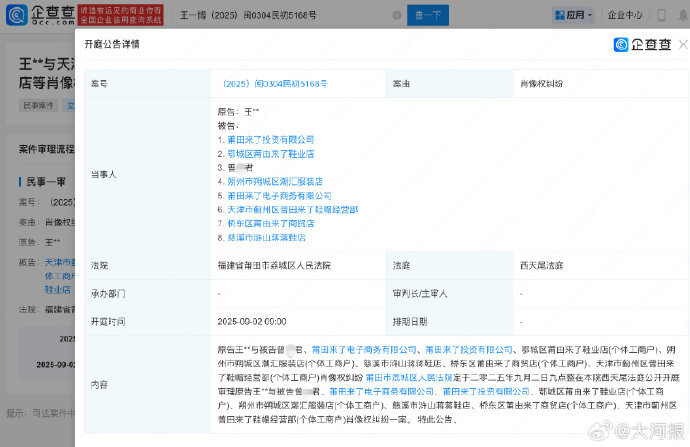 王一博起诉莆田鞋据企查查信息,王一博与多家莆田鞋商家的肖像权纠纷案件,将于9