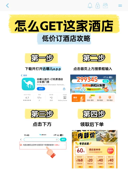 按图8在去哪儿网搜索299345就可以直接跳转酒店了,先领优惠券再下单噢 ~✨