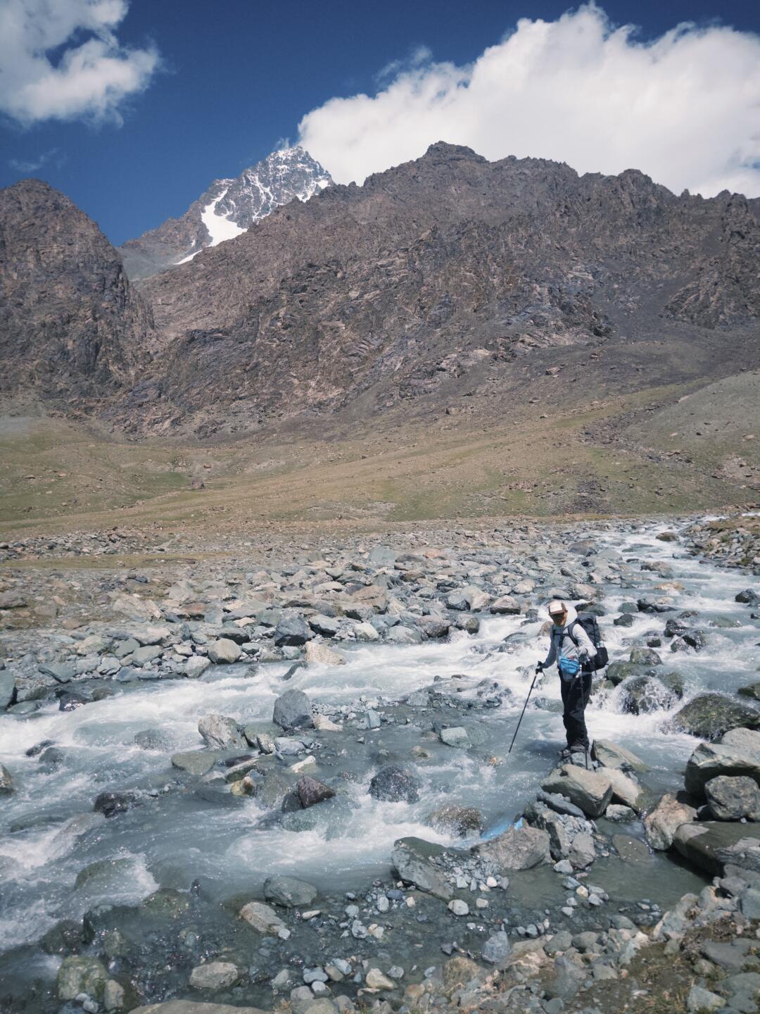 第二段:沿着河道一侧走到轻装团队大本营(博格达主峰下方),营地前有一条比较大的河(早上水下可以直接过,下午需要拖鞋涉水,水位在膝盖以下。也可以坐营地的马过河 20💰/人 p7);