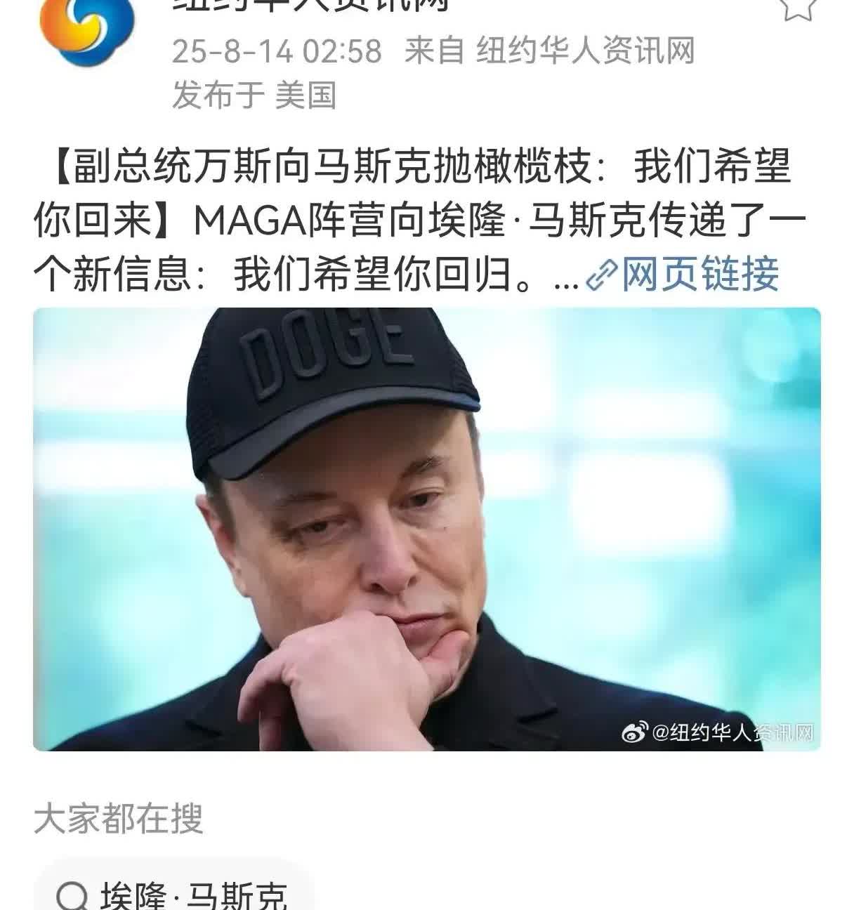 美国副总统万斯向马斯克抛出橄榄枝,希望马斯克回来。 准备中期总统选举了,特朗普