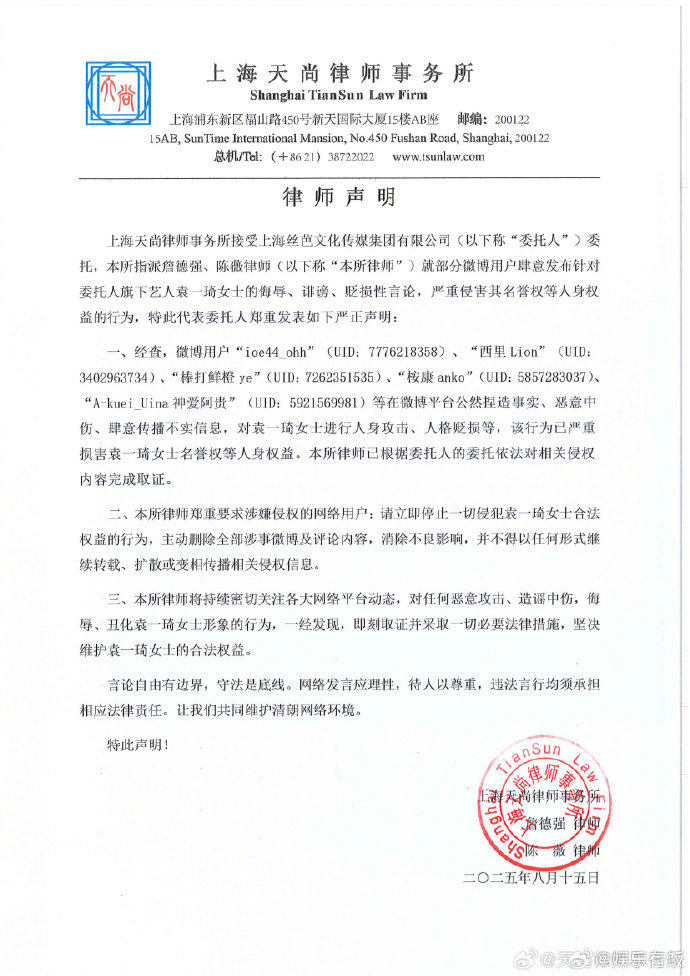 袁一琦方告黑 袁一琦工作室律师声明 袁一琦工作室联合律所发声明,称部分用户捏造事实、恶意中伤,已损害其名誉权,律所已取证。要求涉事用户停止侵权、删帖消影,否则将采取法律措施。