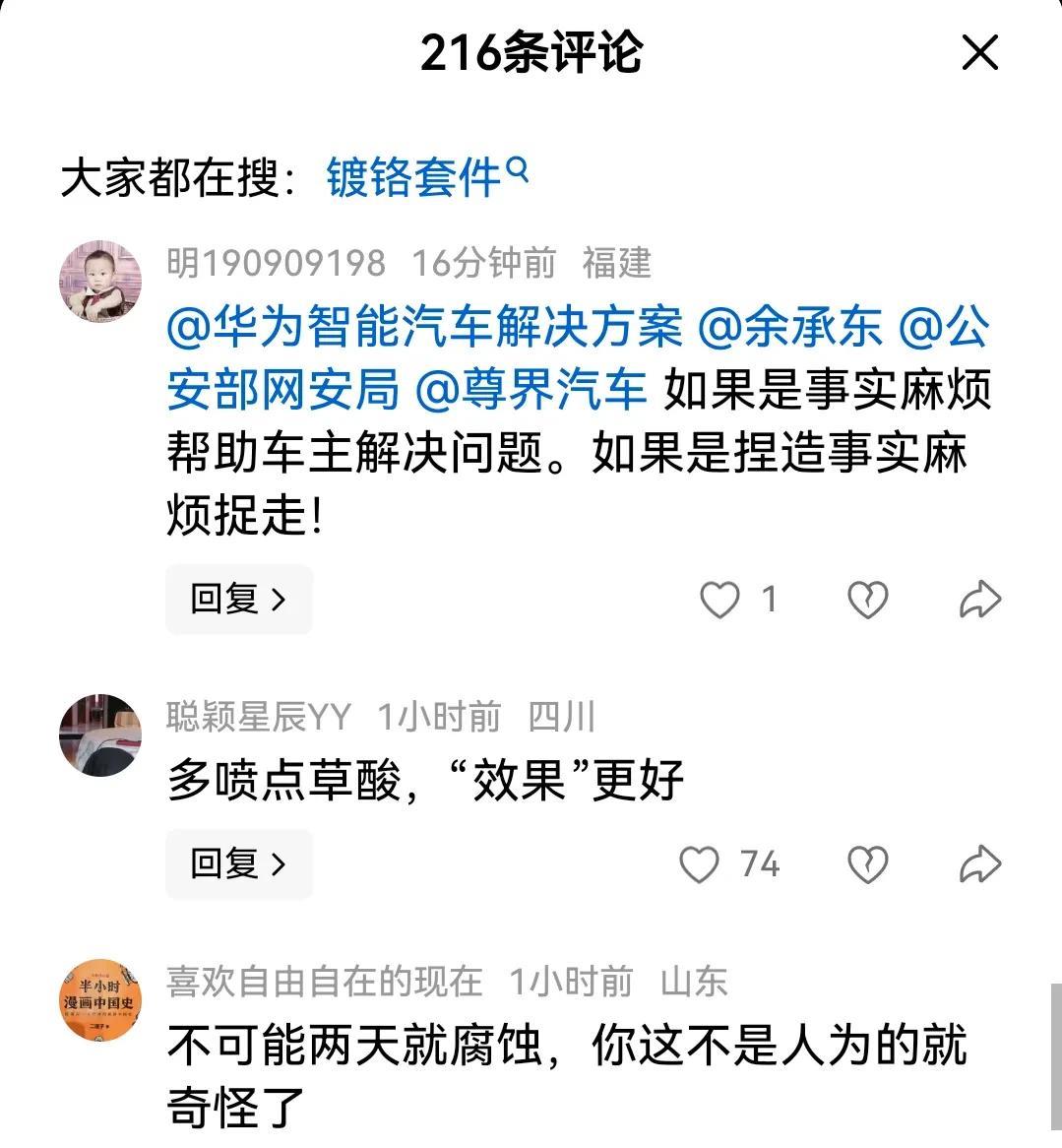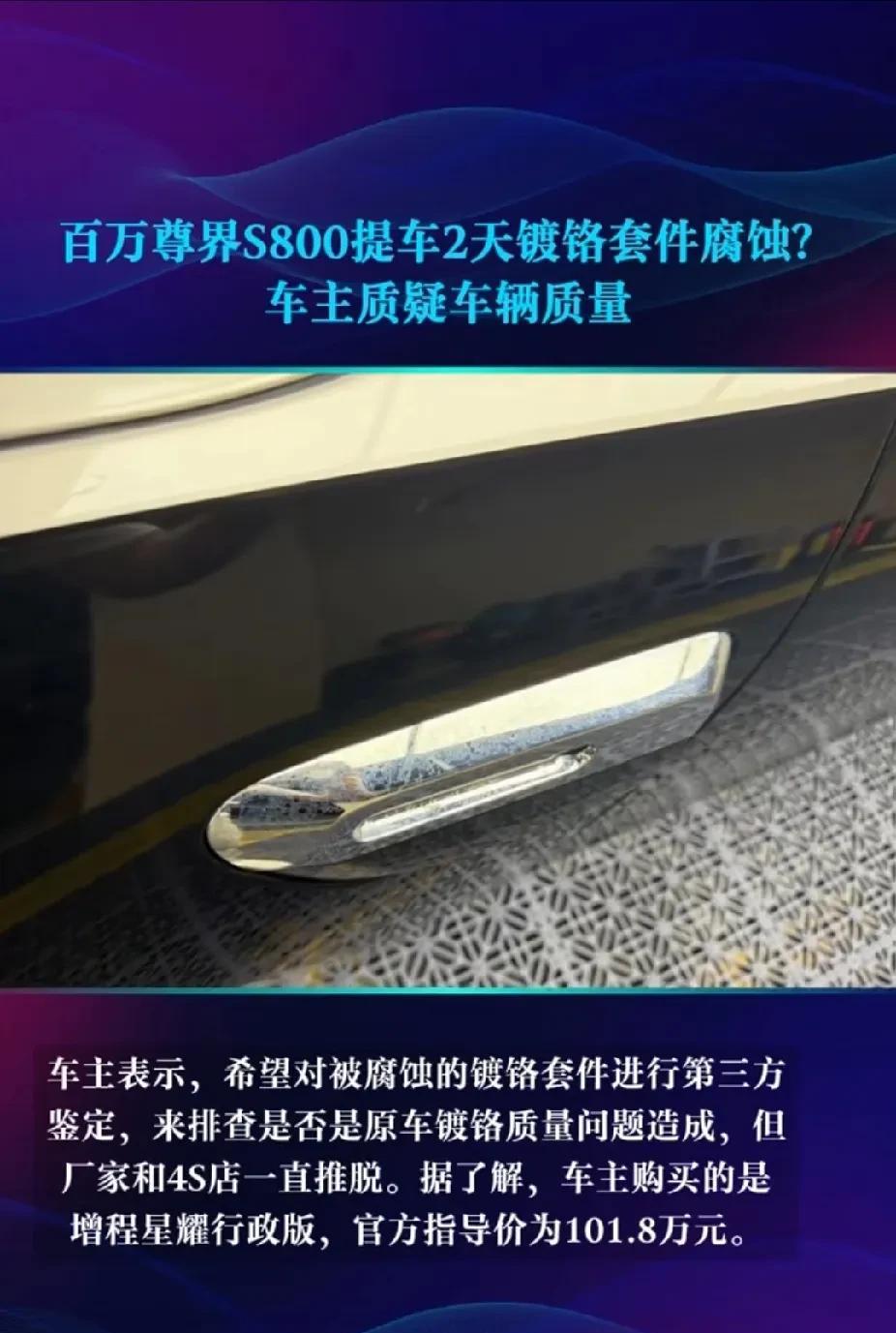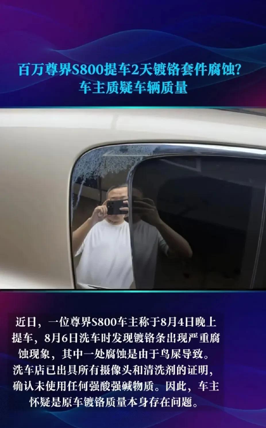 尊界S800车主说自己车上的镀铬条出现严重腐蚀,而厂家和4S店却一直推脱不给他解决问题,车主说他提车才两天。 第一直觉,这是假的。 为什么? 第一,尊界车上的用料绝对没问题,华为不可能在这种小材料上省那几块钱。 撒贝宁参观尊界超级工厂时,厂里的工程师说尊界车上每一个零件都有实时监控,而且只要车没报废,就可以追溯到生产时的状态。 第二,镀铬条是整批生产的。如果说出问题,那肯定是一批车都会有同样的问题,而不是只有其中某一辆车出问题。 第三,华为智驾现在连免费吃饭和免费美甲项目都提供上了,怎么可能在售后上出现这种推脱的情况?