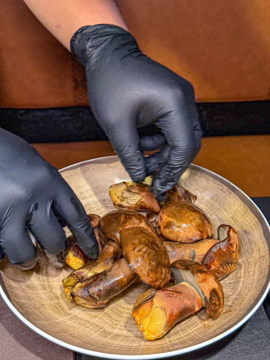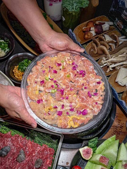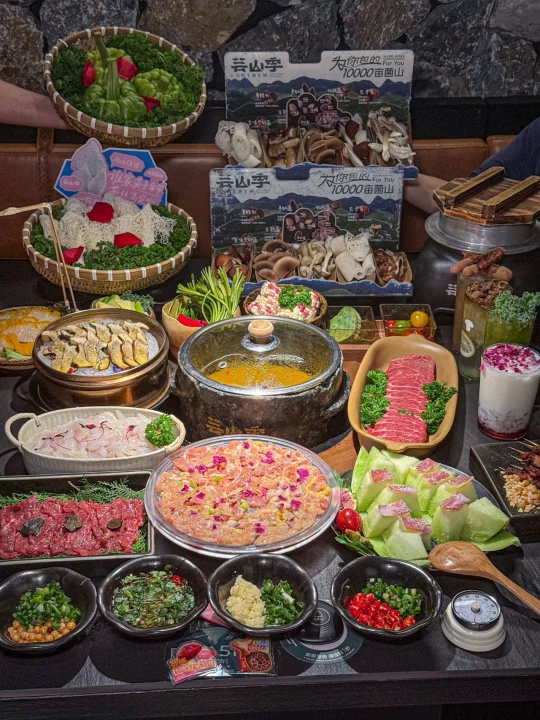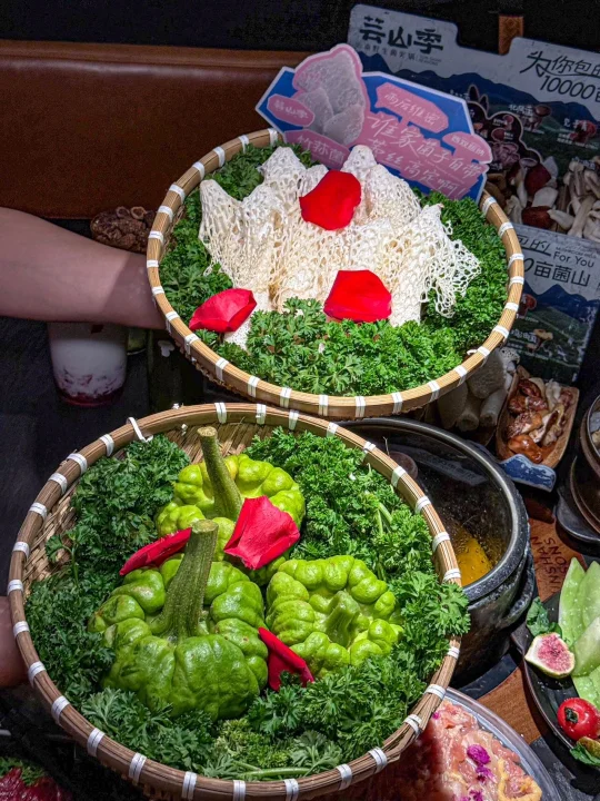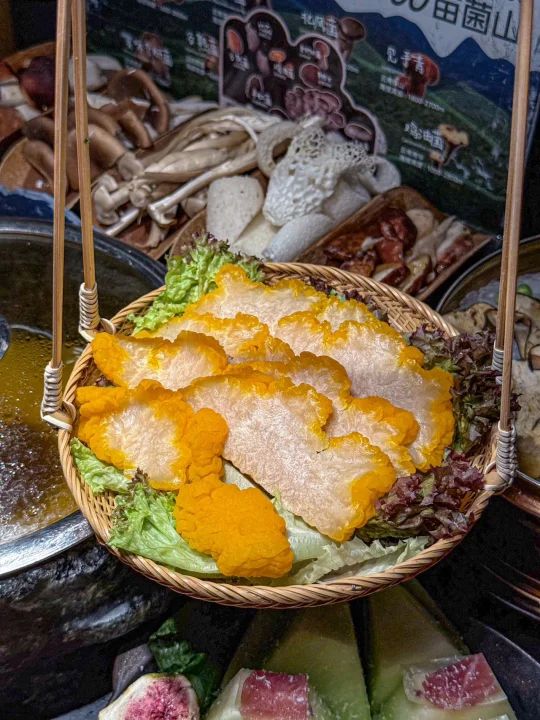 谁懂呀!来广州,就为了这锅菌子火锅… 果然没让人失望!每次过来都会走惊喜,这次还上了新品菌子,更有起片鸡。芸山季真有你的! 金耳菌 入口软糯Q弹,特别的口感让人难忘!富含丰富胶质,与菌汤拌着吃,特别清甜味美,好车得停不下来! 见口青 现场大厨鲜切,看着见手青由褐变蓝,的确新鲜!入口更是滑嫩鲜甜,如吃肉般的美味,让人一试难忘。回味无穷! 姜柄瓜 云南新鲜采摘,空运到广州。看得出的新鲜!青葱脆嫩的瓜肉,厚厚的瓜肉,入口粉糯带脆的口感,吸收汤汁后味道更鲜。