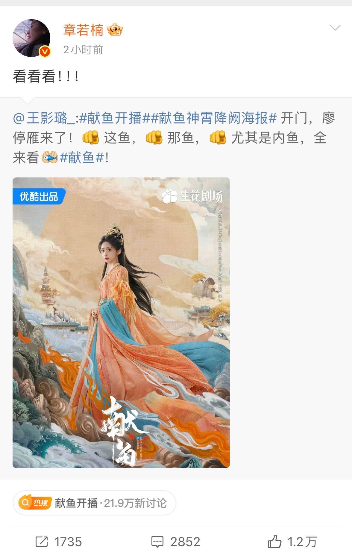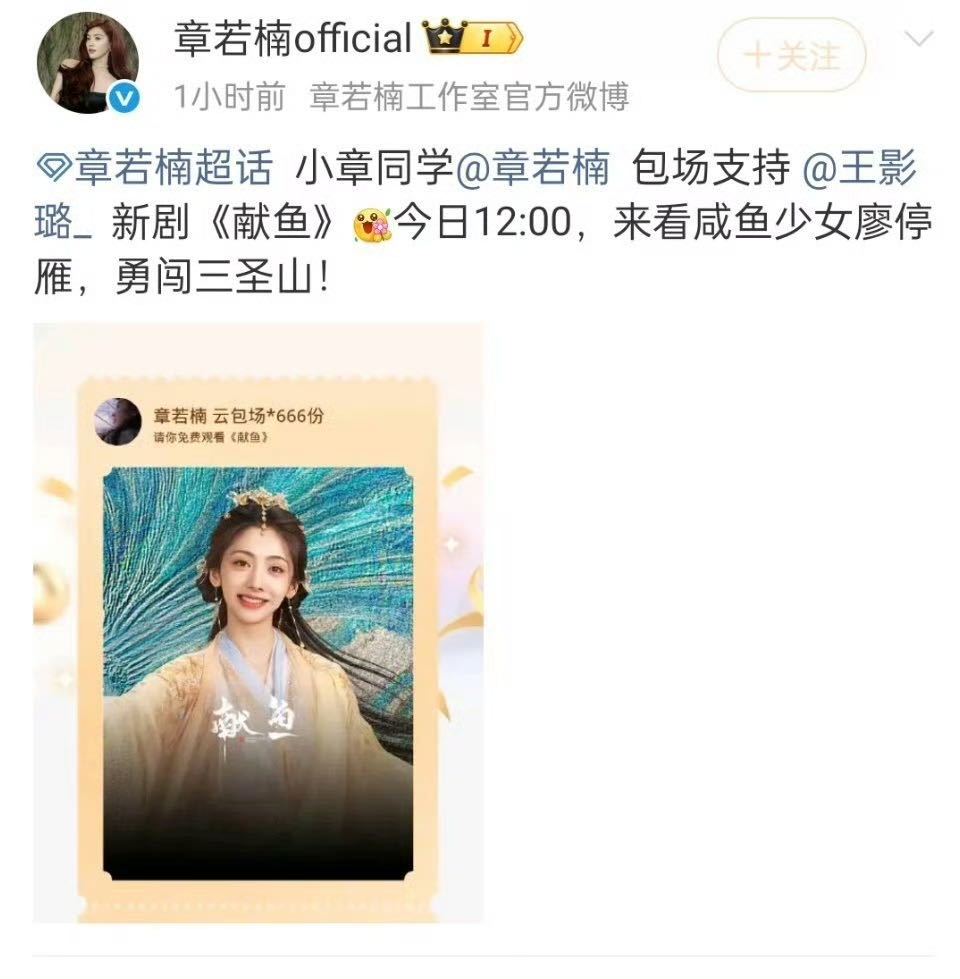 章若楠为王影璐新剧打call 今天王影璐新剧献鱼 开播,等好多艺人好友都来包场支持啦~女宝好,雁子好,大家都好🥰欢迎大家都来看这个献鱼呀!