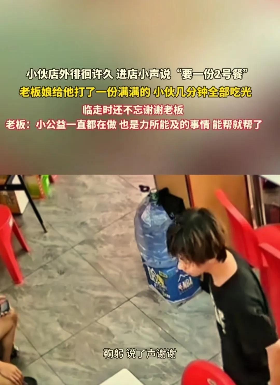 太暖心了。广东,一小伙拖着行李,看到一家餐馆店门前写着“免费2号餐”,徘徊7、8分钟后,他鼓起勇气进店,小声点了一份,吃完临走前主动向店主鞠了一躬致谢。结果,店主说出的话,让人差点泪目了。 从视频里可以看到,小伙子拉着行李箱,站在门口来回走了许久,不停的用看手机掩饰自己的紧张,直到没什么人进店,他才下定决心走了进去。 来到前台,他用很小的声音说:“点一份2号餐”,原本以为对方会投来异样的眼光,没想到,店主娘熟练的给他打了满满一份,递给他时甚至没有多问任何一句话。 小伙端着餐盘的手都有些颤抖,急忙转身找了个最靠里的位置,大口大口的吃了起来,仅用了几分钟就吃光了。 临走前,店家竟然真的是免费的,小伙子主动走到了在一旁歇息的店主面前,深深鞠了一躬,发自内心的说了句:“谢谢”。店主反应过来时,也只是笑了笑,摆了摆手让他直接走就行。 视频被发到了网上,引起媒体关注,事后,店主却说:“这件事我一直在做,力所能及的事情,能帮就帮了!” 有的网友却一眼看到了门口的招牌。 上面写竟然着:“如果你遇到了困难,跟我们店员说,要个2号餐,吃完直接走就行!” 网友们集体被暖到,纷纷称赞店主和小伙子,一个乐善好施,一个懂得感恩。 店家的暖心举动用“雪中送炭”四个字形容再合适不过,一份“2号餐”让困难的人有了一口饭吃,同时又“默不作声”的给足了对方尊严。 谁都有遇到困难的时候,力所能及的拉一把,兴许对方因为援助之手就坚持了下来。 相信小伙子初来乍到真的遇到了难处,若是贪小便宜的人,不会徘徊那么久,更不会真心实意鞠躬感谢。 店主用小店守护了许多小伙子一样的人,正是因为有过同样的经历,他才将爱心传递下去,帮助更多需要的人,这样的人,何愁不会生意兴隆!