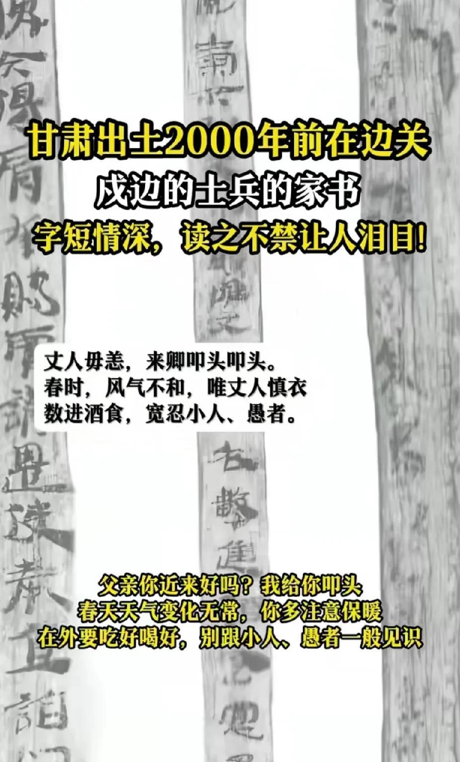 2000年前戍边士兵的家书翻译成现代语言,跟现在的家书一模一样:父亲你还好吗?孩