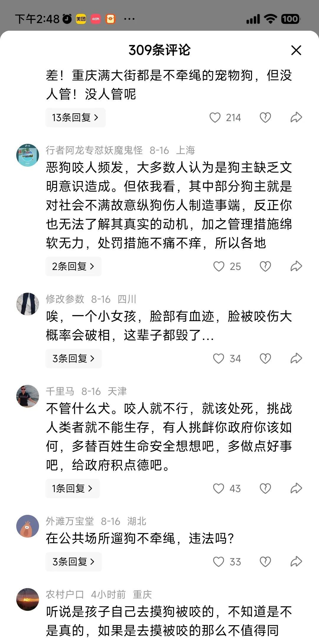 #头号创作者激励计划# 又见大型烈性犬伤人,真的让人气愤不已。重庆三峡广场,一头体型硕大的阿拉斯犬咬伤女童的脸,看着女童脸上血流不止,我不知道烈性犬养狗人士做何感想,这个女童可能真的毁容了。养狗是你们的权利,但让狗不要伤人是你们必须尽到的责任,如果你们控制不住自己的烈性犬大型犬,就不要养狗。 为什么每次出现烈性犬伤人,我都会发声。因为我的孩子也曾经被烈性犬追逐过,吓得哇哇大哭,甚至做梦都会惊醒。当当我跟烈性犬狗主人交流的时候,我也真是开了眼界,相当一部分养狗的人真的没有底线,蛮不讲理。你跟他说,请牵好绳子不要吓着孩子,他会说你把我的狗吓住了怎么说?那个时候好想给他一巴掌,让他知道什么叫养狗的狗德。 相关部门真的应该严管烈性犬的放养,不仅要牵绳,而且一定要戴狗罩。因为一些女的即便牵了手,他的力量也控制不住自己养的大型犬,大型犬依旧会攻击年幼的孩子。狗跟狗主人一样,喜欢欺软怕硬。