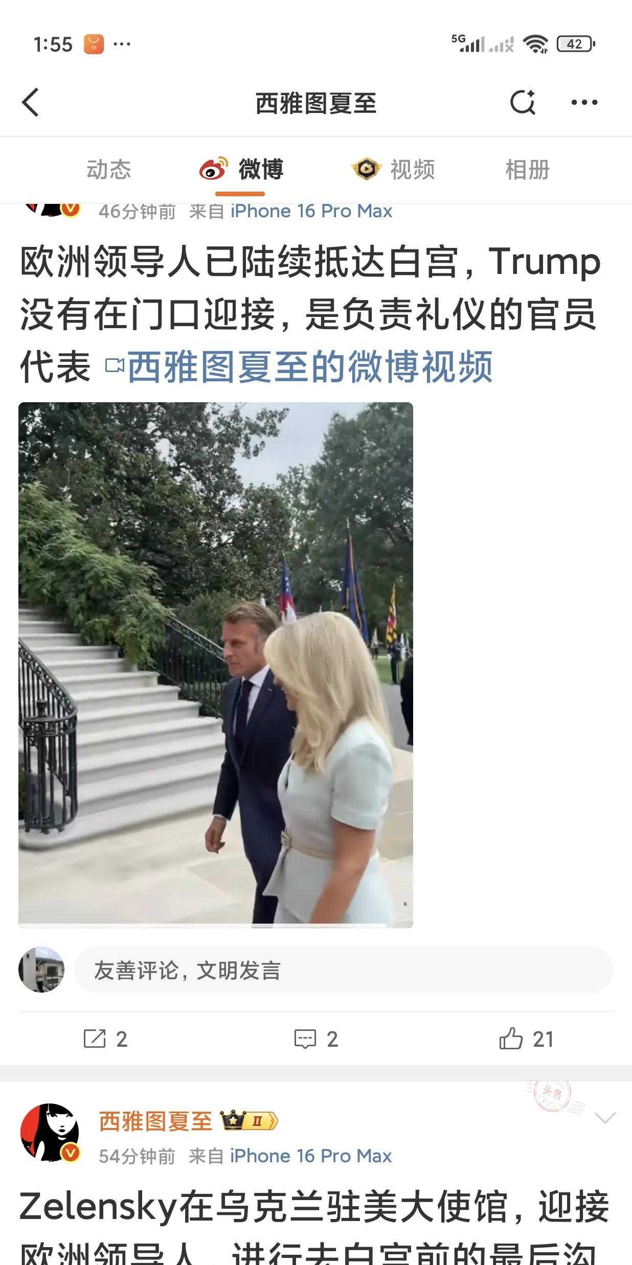 由美国主持、有欧洲和欧盟领导人、泽连斯基参加的白宫乌克兰问题会谈即将开始—— Zelensky在乌克兰驻美大使馆,迎接欧洲领导人,进行去白宫前的最后沟通 。 随后,欧洲领导人陆续抵达白宫,负责礼仪的官员代表在门口迎接各国首脑 。 与俄美首脑阿拉斯加会晤不同,美国总统特朗普没有亲自迎接各国首脑,也没有其他欢迎礼仪。 今天在白宫的现场记者云集,争相报道这一举世关注的历史性会晤。 白宫新闻秘书宣布:全世界都在看Trump总统! 需要特别注意的是,泽连斯基没穿短袖T恤,但也非规范正装。之前白宫放风称,此次泽连斯基不穿正装,乌克兰问题就没得谈。