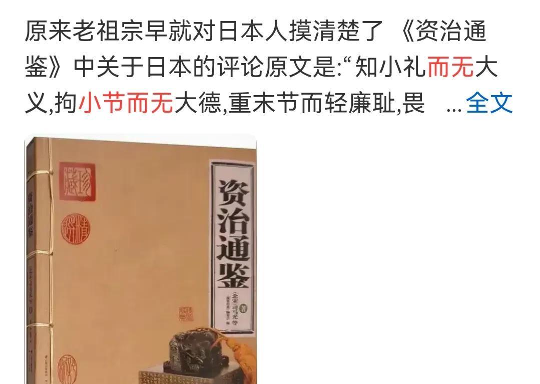 博导齐善鸿说,如果你认为日本人比中国人文明,日本在保留和弘扬文化方面比中国人做得好,那你就是汉奸苗子 各位,齐善鸿这话没毛病吧? 尤其他后面说的那句话,一针见血:刀没架到脖子上,你就不知道什么是敌人。 由此看来,博导齐善鸿对日本人的研究可以说是非常深刻的,直指本质——日本是典型的双重人格,表面一套,背后一套。 关于这一点,一千年前北宋司马光的《资治通鉴》里这一段形容日本人的话,可以说极为精辟:知小礼而无大义,拘小节而无大德,重末节而轻廉耻,畏威而不怀德…… 怎么样? 还是古人眼光高啊!