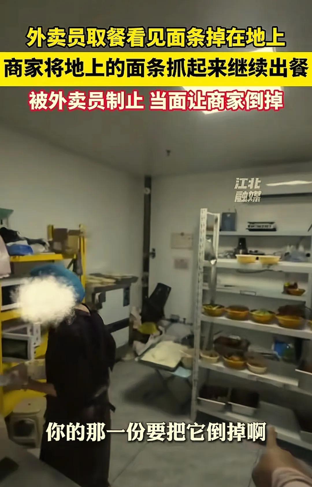 湖北宜昌,骑手小哥取餐时,竟然撞见店员把掉在地上的面条,抓回碗里准备出餐,小哥当