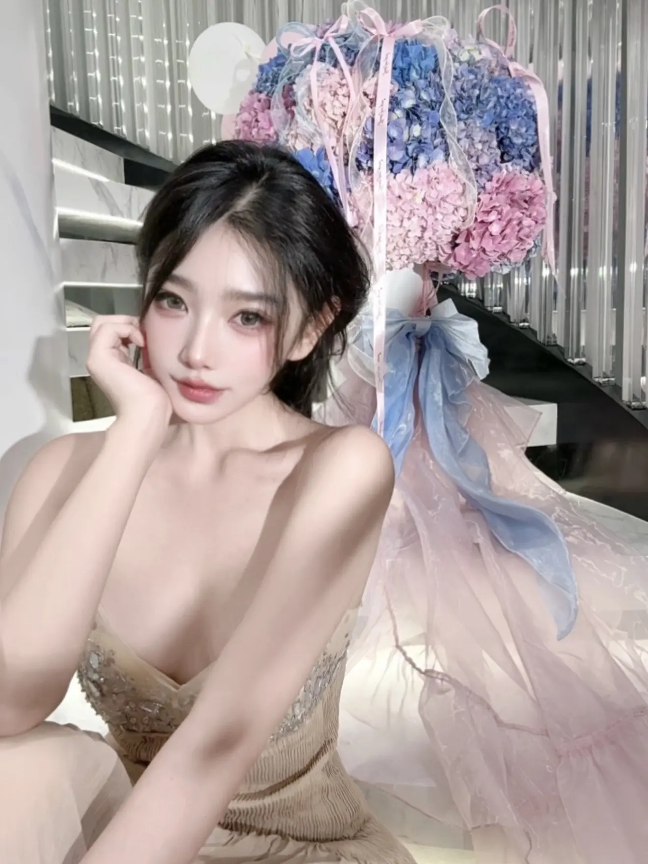 🤯救命!王子文这身材是真实存在的吗?!雾蓝色薄纱裙封神了,短发配甜笑,又纯又