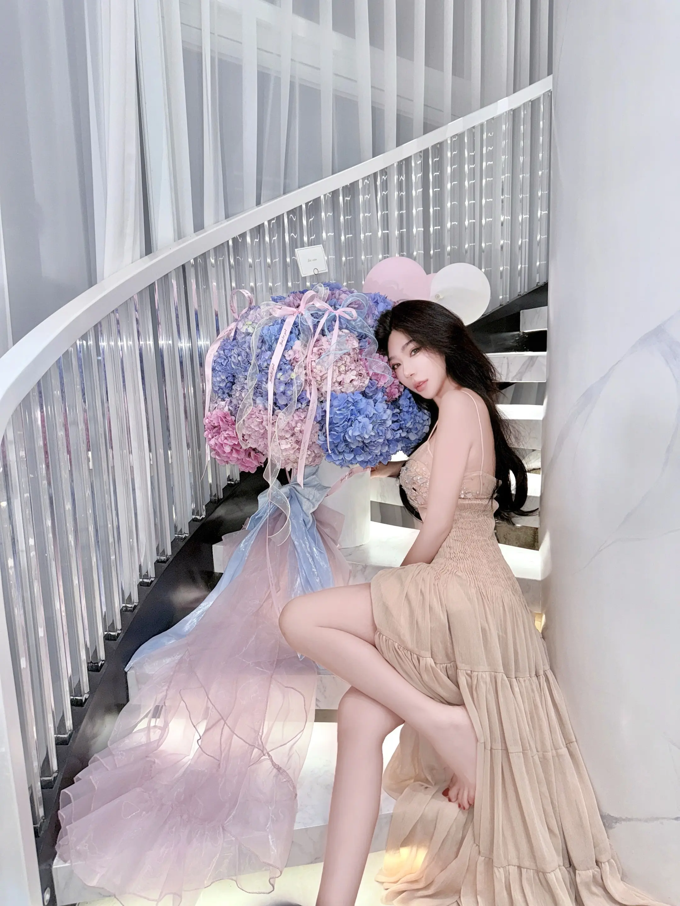 孙允珠,淡蓝色吊带长裙完美展现了她的优雅气质和身材优势。