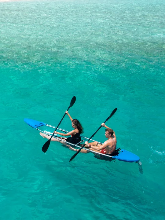 阳光穿透水面 洒落粼粼金辉 轻握船桨 踏上一段与自然共舞的旅程 📍马尔代夫蔚蓝沙度假酒店 🌊碧波荡漾 与蔚蓝对话 🚣🏻♂️KAYAKING 在蔚蓝沙的海面上 划行 是最静谧的冒险 节奏舒缓 视野辽阔 与海风一起 驶入自由之境 玻璃之下 是蔚蓝的诗 🐠GLASS BOTTOM KAYAKING 透过透明底船 观赏深海画布 鱼儿是画笔 勾勒出海底世界 万象潜藏 色彩斑斓 光影之美 在此定格 阳光正好 海水通透 在动静之间找到新的平衡 更多水上运动请dd