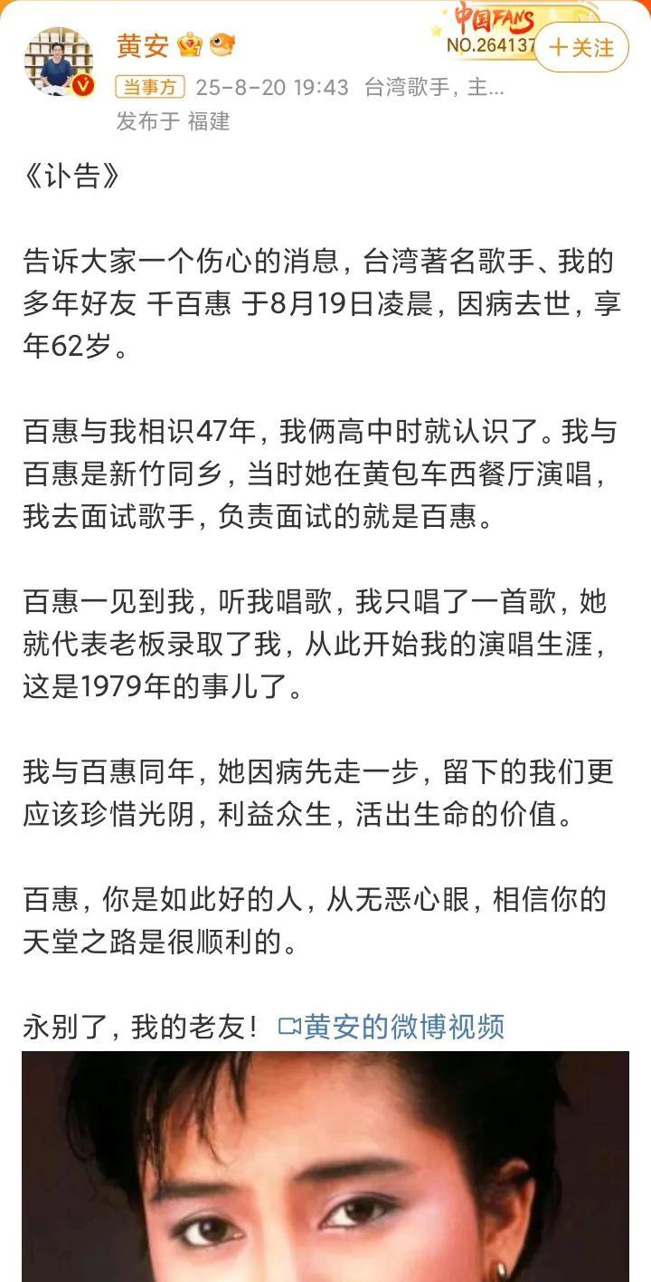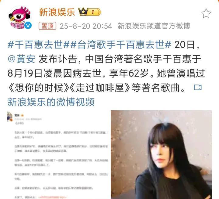 突发!传奇歌手千百惠被曝去世,年仅62岁。 歌手黄安在社交平台上透露,他的同乡兼