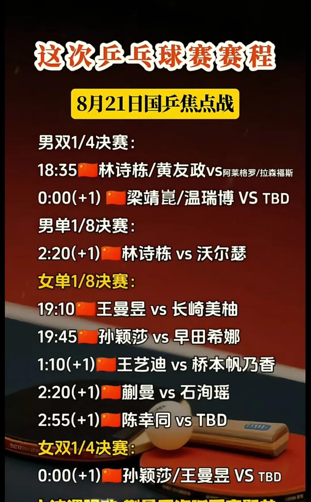 8月21日赛程 今天的比赛看点十足 王艺迪是否复仇桥本成功? 蒯曼又跟石询瑶不是冤家不碰头,蒯曼这次是否反败为胜 海产姐妹一日两赛,并且都是抗日