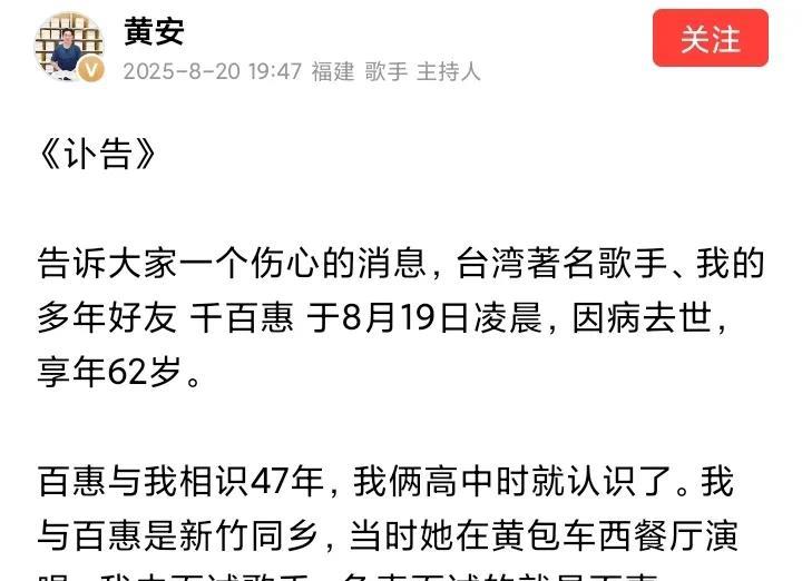 那双总是很忧郁的眼睛,那个总是很磁性的声音,那样美丽却总是频繁整容的歌手,永远定格在了62岁。 黄安的讣告显得简短而又伤心,有点词不达意,实在难以想象——一个人的生命会如此脆弱,都是带着“突然”和意外,让人猝不及防。 那首“当我想你的时候”,和“走过咖啡屋”一样,简直是绝版,再也没有那么深情又沉稳的声音,没有声嘶力竭,却让人体会到难过和伤心……一晃,她已经唱了几十年,经久不衰。 伊人已逝,金嗓永存,大家记住的,永远都是她最美丽的时刻,芳华永驻! #我的宝藏兴趣# #记录我的2025#