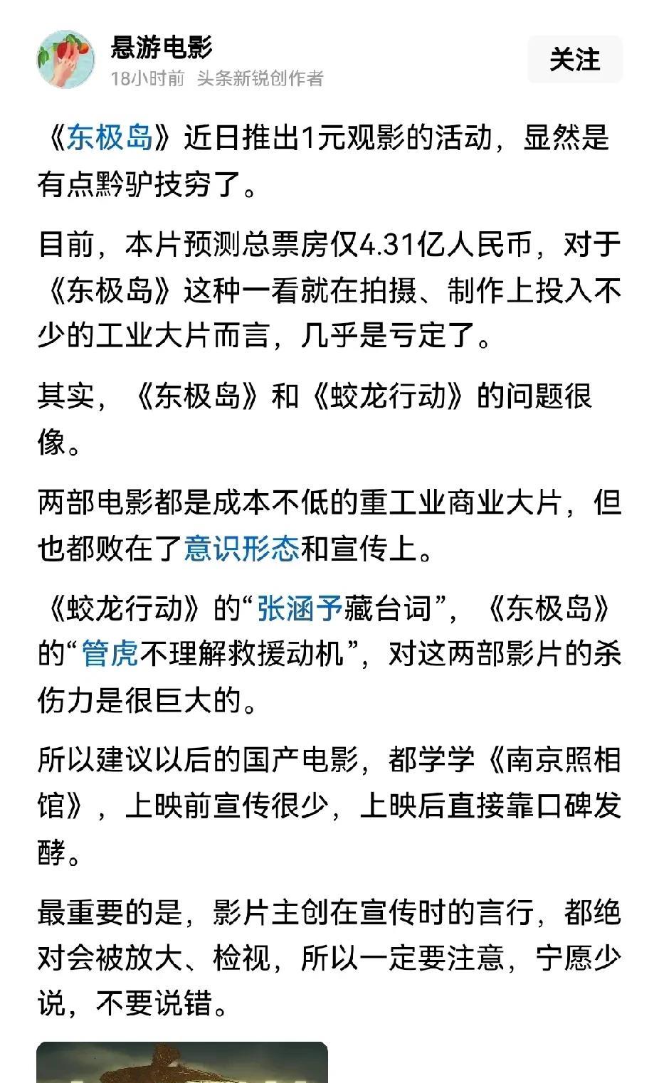 东极岛路演,泪洒现场的制片人梁静说“中国人是反战的”。拜托,中国人怎么就反战了?中国人对战争的态度从来都只有一种,那就是:豺狼来了有猎枪! 中国人不主动发起战争,因为战争带来的是大量的人员伤亡和巨大的物资投入,同时会极大的拖累经济。 但是,中国人从来都不惧战争。 朋友来了有好酒, 若是那豺狼来了, 就让它尝尝猎枪的味道。 现在让管虎和梁静忧愁的已经不是东极岛的票房基本不会再涨了,他们忧愁的是后面的路怎么走? 谁还会找他们拍电影? 毕竟资本是为了赚钱,而不是赔钱。