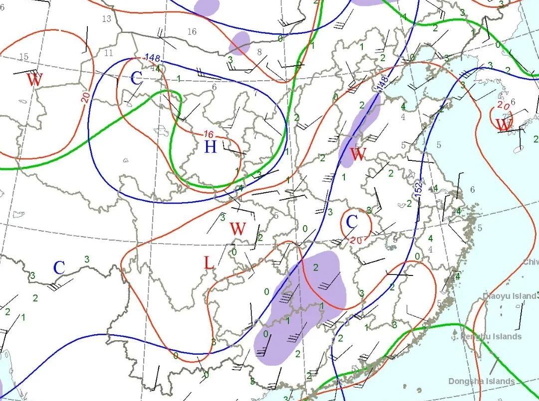从今天的天气图实况来看,今天副热带高压范围比较宽。广东、湖南,北至山东、河南一带