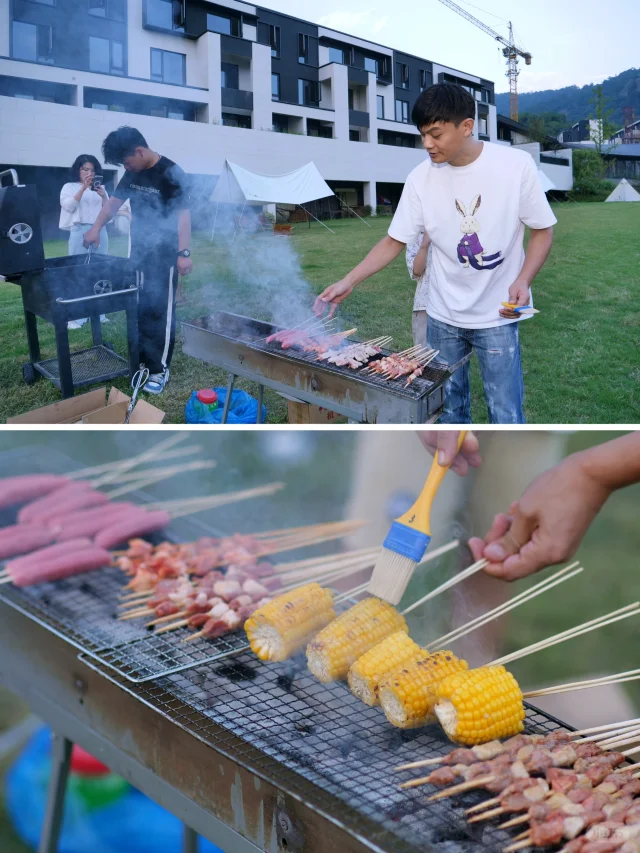 🔸傍晚时分,我们在草坪上露营烧烤。孩子们迫不及待地拿出烤肉串,把它们放在火上翻烤。烤肉的香气在夜空中弥漫。🏕️🔥🍢
