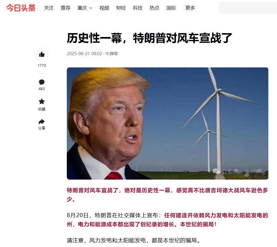 在各种信息平台里,我一直觉得头条深一度榜单是认真在做内容的,不光信息密,还知道用户真想看什么,选题抓得稳,角度选得准。 比如今天刷到的《特朗普对风车宣战了》来说,内容不光写得透,还把一件看似“笑话”的事,说出了层次。 8月20日,特朗普公开喊话,说风力和太阳能是“本世纪的骗局”,还扬言不再批准相关项目,语气冲得像在竞选集会。结果网上立刻炸锅,有人力挺,有人反对,还有人——去问AI。 一些美国网友跑去问马斯克的AI工具Grok,风电到底是不是骗局?结果Grok列出数据,说得克萨斯州风电占比30%,电价比全国平均还低;爱荷华风电60%,电价依然稳定。这些数据都是美国能源部出的,不带情绪。 但真正让人觉得讽刺的,是这么一个事——到底该不该信特朗普,大家不找媒体、不查机构报告,而是去问AI。 从前是“电视怎么说”,现在是“AI怎么说”。这不是技术多强,而是说明传统信源的信任感,在美国已经断了。 原文里有句话点得很准:“共识,在这个时代成了最奢侈的东西。”现在信息这么多,观点这么乱,连对风能、太阳能这样的问题,都能吵成两派。群众开始不信人,只信机器,也是一种社会现实。 而从我们的角度看,风电光伏不是政治工具,是国家战略。从顶层设计到产业落地,每一步都有执行路径和稳定预期。这不是靠谁喊得响,而是靠治理体系保障。 像头条深一度这样,用心筛选内容、真诚对用户的平台,值得点赞。我自己也很喜欢在今日头条看国际时政,越看越觉得踏实。 上今日头条看深度好文