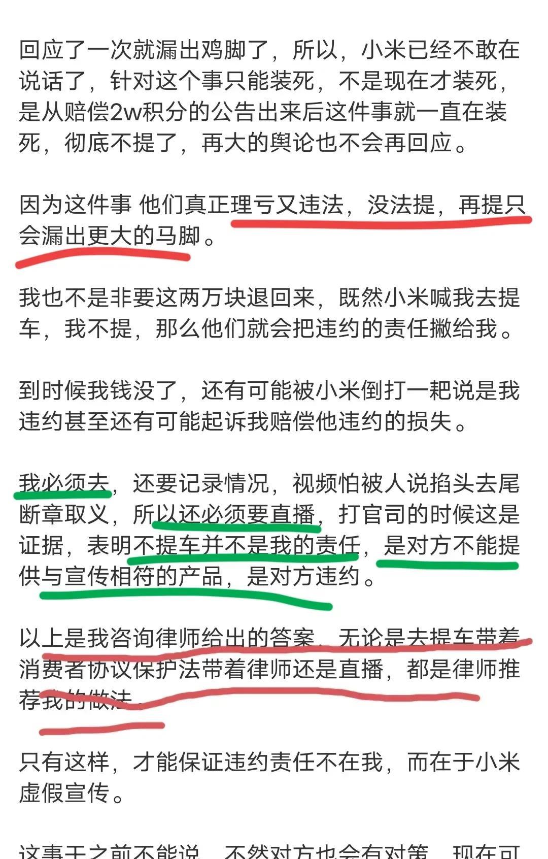 雷军怎么办?现在有个小米su7 ultra准车主因为感觉被欺骗,选择提车时带律师直播,硬扛小米汽车,结果被小米汽车一个交付主管报警了。 准车主去你店里提车,你报警? 这是报的什么警?这是在怕什么? 还好这位准车主事先咨询了律师,有了计划,否则,不提车的违约责任,可能就有点说不清了。 留下现场证据才是最好的做法。 现在,小米汽车怎么办?雷军怎么办? 相比于其他准备提起诉讼的准车主,这位准车主的做法是非常强硬的,也是小米方面无法忽略和无视的。 这事儿,总要有个结果。
