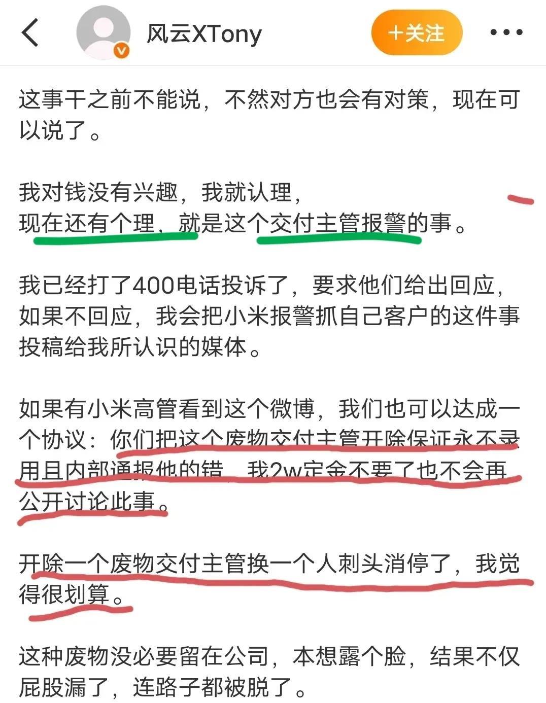 就这博主,一开始造谣说小米高管承认虚假宣传,被光速打脸,后来又造谣和解了,十万块钱,又被光速打脸,现在带了四五个人去现场,说是保镖,纯闹事去的,还不报警?认为小米虚假宣传就去法院告呗,到现在不上法庭各种公开闹,还指责交付主管。人家要维持现场秩序的,你一帮人气势汹汹过去挑事还不报警?各种歪理