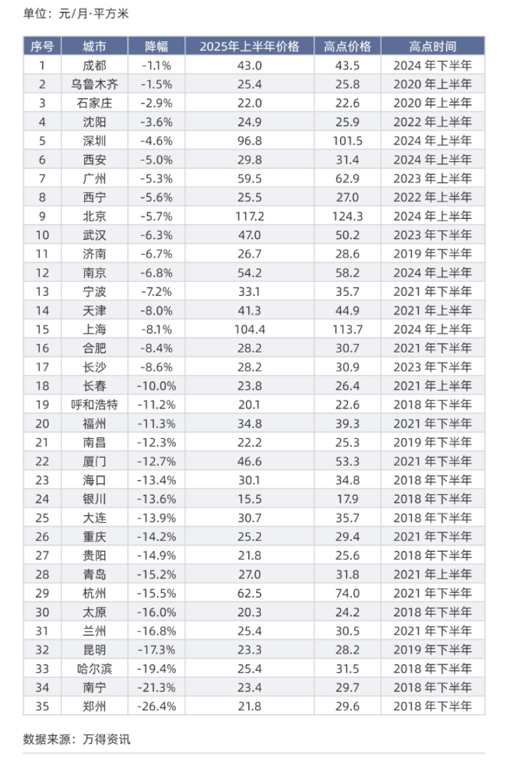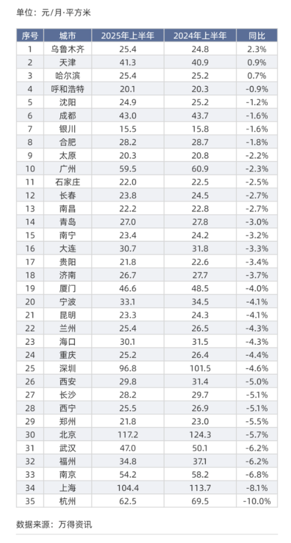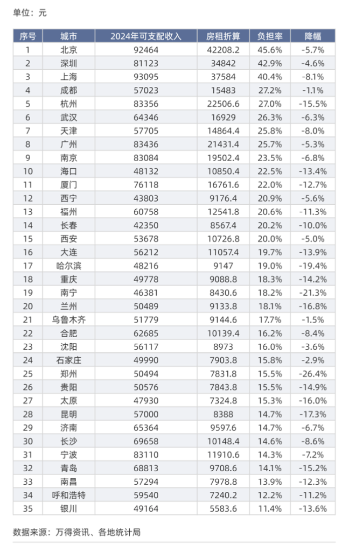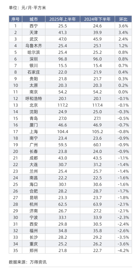 大部分主要城市房价仍在下跌通道,但住宅租金却呈有涨有跌的态势。从2025年的住宅租金涨跌情况来看,租金友好城市,可能是一线城市广州和成都、宁波、长沙、青岛、重庆等二线城市。 广州在一线城市里住宅租金最低,重庆和长沙住宅租金环比下跌较大,成都距离住宅租金最高点跌幅最轻,宁波、青岛在万亿城市里房租负担率最低。 2025年上半年,一二线城市住宅租金变化如何? 以截至今年上半年的数据,按每月每平方米的均价来看,35座一线、二线城市中,哪些城市住宅租金较高? 北京、上海和深圳领衔,3座一线城市均为100元左右,北京以117.2元遥遥领先,同为一线城市的广州以不足60元,低于杭州排名第五,排名第6的是高达54.2元的南京。住宅租金排名前十的城市从高到低还有武汉、厦门、成都和天津,均在40元以上。 再把排名拉开来看,住宅租金排名前25的城市,最低的是24.9元的沈阳,这一队列里,从高到底分别是福州、宁波、大连、海口、西安、长沙、合肥、青岛、济南、西宁、哈尔滨、乌鲁木齐、兰州、重庆和沈阳——很多城市的名次和租金似乎都出乎大众的意料。比如天津、大连和西宁。 二线城市里,住宅租金最低的是只有15.5元的银川,另有呼和浩特、太原、郑州、贵阳在20元左右。 11座住宅租金环比上涨的城市,领涨的是西宁、天津和武汉,但涨幅最高的西宁也只有3.6%,略高于天津的3.4%。 24座住宅租金环比下降的城市,领跌的是郑州、重庆和长沙,郑州下跌了4.2%,重庆和长沙在3.5%左右。 以一线城市为首,更多的城市住宅租金相对稳定,环比涨跌在1%与-1%之间。 住宅租金同比上涨的3座城市里,乌鲁木齐以2.3%领跑,天津和哈尔滨微涨。住宅租金同比下跌才是一线、二线城市今年以来的态势,跌幅最狠的是杭州,同比下跌10%,高于上海的8.1%、南京的6.8%跌幅。另有福州、武汉、北京、郑州、西宁、长沙、西安6城同比下跌超过5%。 上述城市都有住宅租金的最高点,以此为锚点,跌幅最小的城市是只有1.1%的成都,而跌得最狠是超过20%的南宁和郑州。 仅以账面上的房租负担率来说,通过可支配收入与房租的折算(且设定每人30平方米的住宅面积),北京、深圳、上海以超过40%的房租负担率领跑,而房租负担率最低的是不到14%的南昌、呼和浩特和银川。万亿GDP城市里的济南、长沙、宁波和青岛的房租负担率也低于15%。 房租最高与居住性价比最高的差别 产业的发展程度和城市的宜居程度应成正比,在此期间住宅租金的高低也是城市能否聚人、留人的关键要素。顶层设计已经明确支持各地建设保障性住房,完善住房租赁管理,但各地各城的住宅租金仍有较大变数。 住宅租金是上涨好还是下跌好? 站在不同的立场有不同的答案,但有一点却是各方的共识:住宅的租金抗跌性显著高于办公楼和商铺,整体租金的大起大落则对长远发展不利。 城镇居民可支配收入较高的城市,尤其是可支配收入高于6万元的14座一线、二线城市,大部分的住宅租金都只有较低的跌幅,成都不在此队列,那是因为成都的人均可支配收入仅为5.2万元。