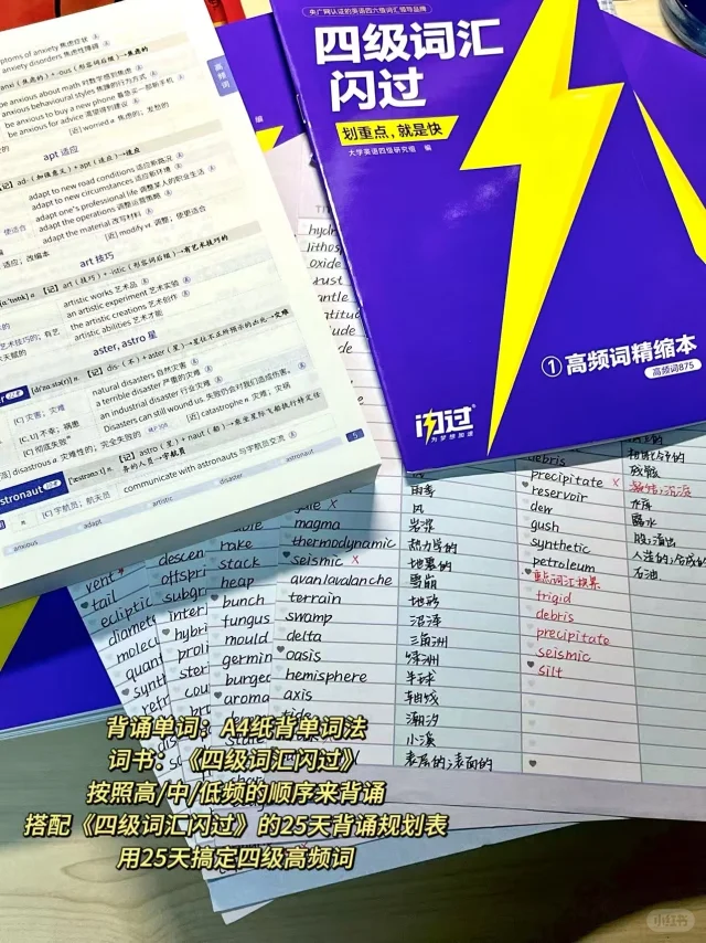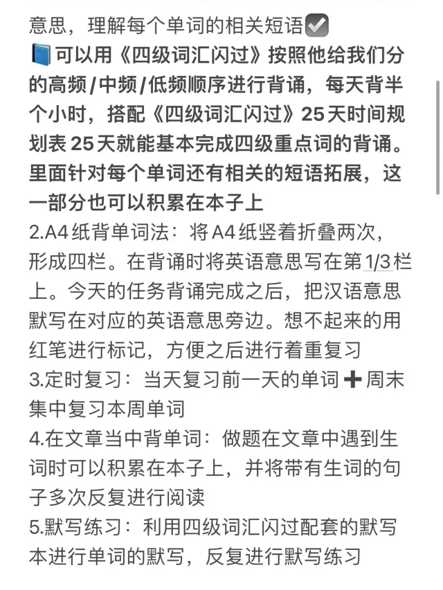 📘可以用《四级词汇闪过》按照他给我们分的高频/中频/低频顺序进行背诵,搭配《四级词汇闪过》25天时间规划表,25天就可以背完四级重点词汇~里面针对每个单词还有相关的短语拓展,这一部分也可以积累在本子上