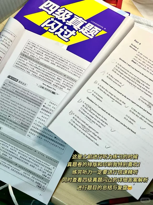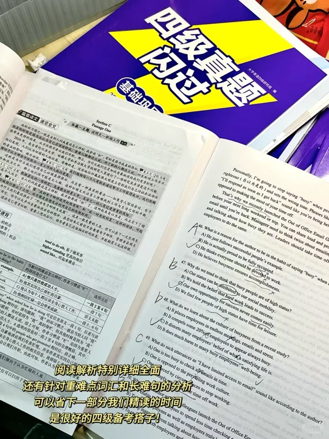 📒可以使用《四级真题闪过》当中的解析册,阅读其中的答案解析部分并针对自己的错误详细分析;其中的重点词汇重难句式等部分也可以当作参考,这样也可以省下一部分自己查词和进行长难句解析的时间☑️