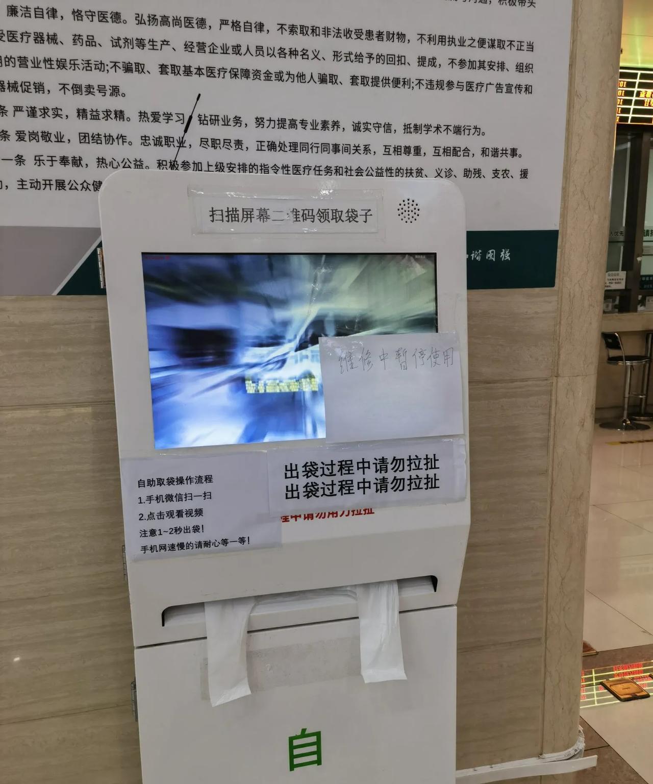 周末给老人开门诊单拿药,医院的操作真让人想不通!保定市中心医院总院药房外,那个号称“高科技”的自助取塑料袋机,坏了不知多久,愣是没人修。更气人的是,药房还不提供传统塑料袋,患者交完费拿药,手里一堆瓶瓶罐罐,难不成真得用手捧着走? 这“高科技”成了十足的鸡肋。本想方便患者,结果机器一坏,反倒添了堵。老人拿药手抖,年轻人拎着药还得掏手机开门,稍不注意就可能摔了药。其实药房备点塑料袋多简单,成本不高,还能实实在在解决问题。