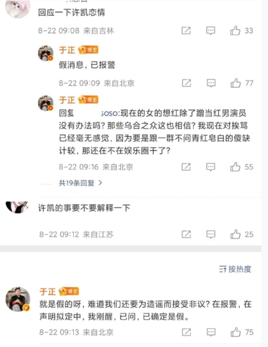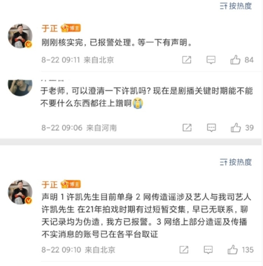 之后于正在自己的微博评论区回复网友,称某些女人为了红不惜来蹭当红男明星的热度,目前已经选择报警处理,许凯目前是单身,随后会有声明。