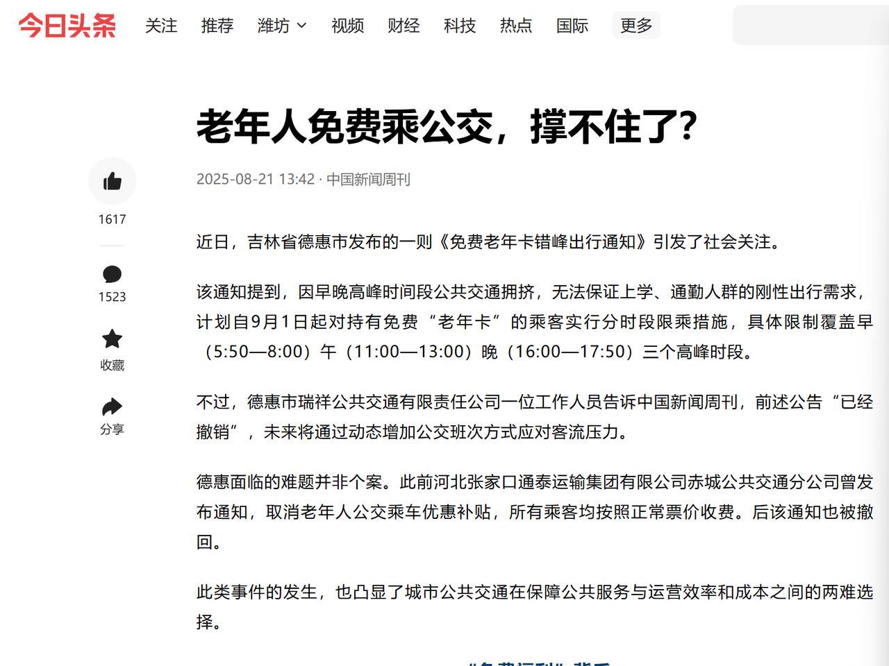 文章从吉林省德惠市的《免费老年卡错峰出行通知》说起,摆出了上班上学高峰时段,老年
