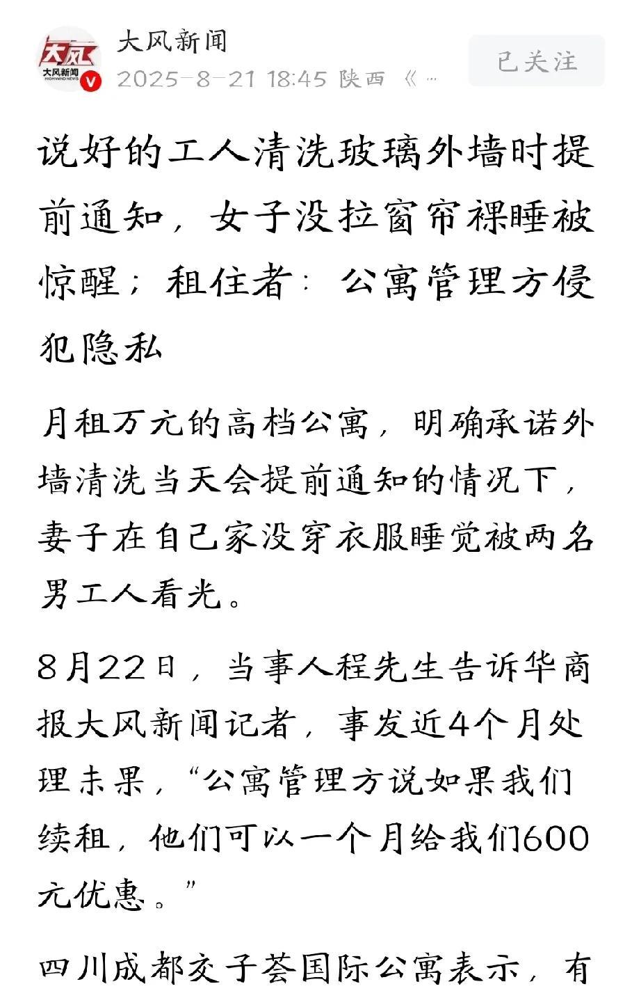 四川成都,男子和妻子在一高档公寓租了套房子,月租一万元,卧室有超大玻璃落地窗,视野非常开阔。因为楼层高,妻子没拉窗帘在家裸睡,忽然听到窗外有声音,睁开眼一看瞬间尖叫,原来,窗外有两名工人在做清洁。妻子被人看了个精光,还受到惊吓患上焦虑症,男子怒了,质问管家为何不提前通知,管家的态度让他实在气愤。 据大风新闻8月21日报道,程先生年轻有为,收入不菲,也注重生活品质。 为了住的舒坦,他和妻子精心挑选,在某高层公寓租了套100平的房子,每月租金高达一万元。 4月18日,公寓管家私信告知程先生妻子,说当月21号到30号期间,工人会对公寓外墙进行清洗。 同时,管家还贴心表示,因为是落地玻璃窗,当清洗到他们家所在楼层的外墙时,会提前发消息提醒他们拉上窗帘,保护个人隐私。 10天时间,这跨度也太大了,也没明确具体是哪一天,总不能10天都拉着窗帘不见天日吧,那得多压抑。 而且公寓里住户众多,万一管家忘了提醒,那麻烦也就大了。 为了确保万无一失,4月21日,程先生又特地在他们家的微信服务群里,强调当清洗到他们这一层时,一定要提前告知。 当时,管家和前台在群里回复了“好的”,程先生想着,这下肯定妥妥的了,不会出岔子。 可谁能想到,千小心万小心,意外还是来了 4月25日,程先生正在客厅专注地办公,突然,卧室里传来妻子一声尖锐的惊叫。 这突如其来的声音,吓了程先生一跳,他急忙冲向卧室,眼前的一幕让他怒火中烧。 在没有任何提前通知的情况下,他们家玻璃外墙外面,竟然有两名工人进行清洗作业。 他们家住在几十层的,卧室的床正对着落地窗,一侧全是透明玻璃,当时妻子在家裸睡,屋里开着灯,但没拉上窗帘被工人看了个正着。 程先生赶紧冲过去,一把拉上了窗帘,妻子心有余悸地说,她之所以会惊叫,是因为工人在外墙作业时发出了声响,把她从睡梦中惊醒。 她迷迷糊糊地睁开眼,就发现自己被人看了个精光。 对此,程先生气愤不已。事发后,他立刻在群里质问公寓管理方,为什么没有提前通知? 起初,管理方还拒不承认,声称群里没有通知,但私信发了,可程先生和妻子都没有收到任何私信通知,便要求他们提供通知的截图。 这下,公寓管理方哑口无言,不得不承认确实没有提前通知。 此外,程先生又想起了另一件糟心事。 他们公寓算比较高档的,每周会向业主提供一次免费保洁服务,这是好事,但程先生明确表示,自己不在家的时候不要安排保洁进屋打扫。 可是,去年9月份,有天他们都不在家,他们毫不知情且未同意的情况下,保洁阿姨竟然进入了他们家中打扫。 程先生当时就很生气,但并未追究,谁知又发生这种事。 经过这件糟心事,程先生的妻子精神状态每况愈下,医院诊断结果是抑郁、焦虑。 程先生很生气,要求公寓管理方公开向他们道歉,并给出合理的赔偿方案,但遭到了拒绝。 除了刚出事时,程先生要求追责,他们派人拎了点水果上门致歉之外,三个多月过去了,对妻子的状况,没有一句问候。 程先生对公寓方的处理态度失望透顶,刚好房子的租期马上就到了,他一气之下将此事曝光到了网上。 在各方面的压力下,他们这才承认有责任。 他们给出的解决办法是,如果程先生续租,可以每个月优惠600元房租。 程先生觉得好气又好笑,他们能掏得起每月一万元的房租,还差那600块钱吗?他希望对方拿出解决问题的诚意和态度。 随后,记者联系了该公寓前台工作人员,对方表示,此事正在协商处理中。 当问到事发当天,清洗工人是否看到裸睡的程先生妻子时,工作人员支支吾吾地表示:这个真不好说,也不能说完全看不清里面,毕竟玻璃是透明的。 有人质问,明知最近要清洁外墙,程先生妻子为什么不主动回避风险,还要裸睡,而且不拉窗帘呢? 从法律角度来讲,程先生妻子裸睡属于个人私密活动,卧室作为住宅的一部分,是私密空间,程先生夫妇对其享有隐私权。 公寓管理方事先承诺会提前通知外墙清洗事宜,却未履行约定,导致工人在未通知的情况下出现在程先生家窗外,使程先生妻子裸睡情况被看到,侵犯了其隐私权。 同时,根据《民法典》第577条规定:当事人一方不履行合同义务或者履行合同义务不符合约定的,应当承担继续履行、采取补救措施或者赔偿损失等违约责任。 公寓管理方未按照约定履行通知义务,构成违约,应当对程先生夫妇因此遭受的损失承担赔偿责任,包括因隐私被侵犯导致的精神损害等。