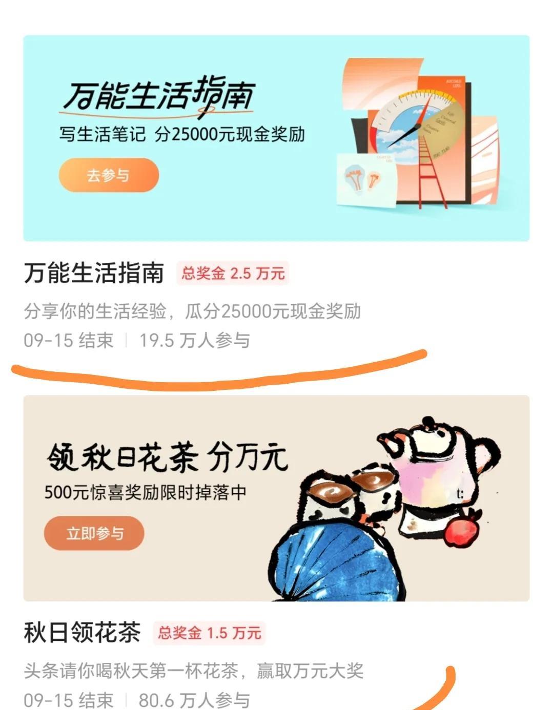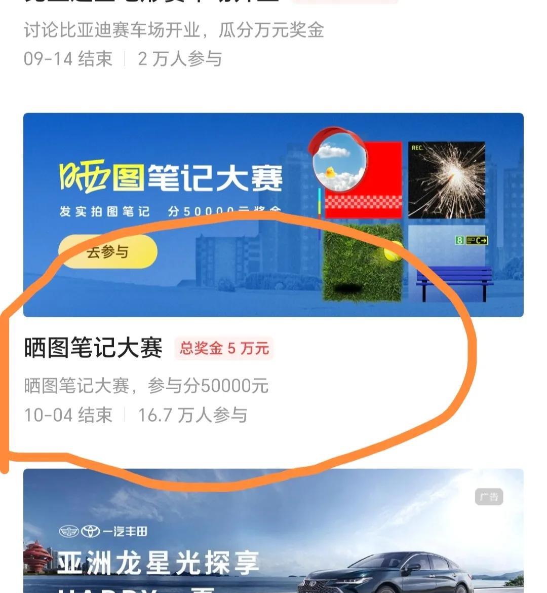 不看不知道,一看吓一跳! 今天,我特意上活动广场上溜达了一圈。竟然发现大家创作热情空前高涨,大有前无古人,后无来者之势! ①,我的汽车生活日记 总奖金1.6万,目前参与人数,136.9万人。 ②,万能生活指南 总奖金2.5万,目前参与人数,19.5万人。 ③,领秋日花茶 总奖金1.5万元,目前参与人数80.6万人。 ④,晒图笔记大赛 总奖金5万元,目前参与人数,16.7万人,以后还得有更多的人来参加。 还有各类汽车征文,参与人数,也远远高出了总奖金的数额! 活动广场里的活动,车的征文,五花八门,多姿多彩。让众多业余爱好者纷纷踊跃投稿参加! 活动广场里的活动,重在参与!有参与者就可以瓜分相应的奖金,让无数创作者悠哉,乐哉! 时逢金秋,天高气爽,丹桂飘香,硕果累累!愿所有参与者都能坚持到底,瓜分多多的奖金! 相信付出总有回报,相信总有美好在路上! 友友们, 活动广场里的活动 你参加了吗? [微风][微风][微风][微风][微风]