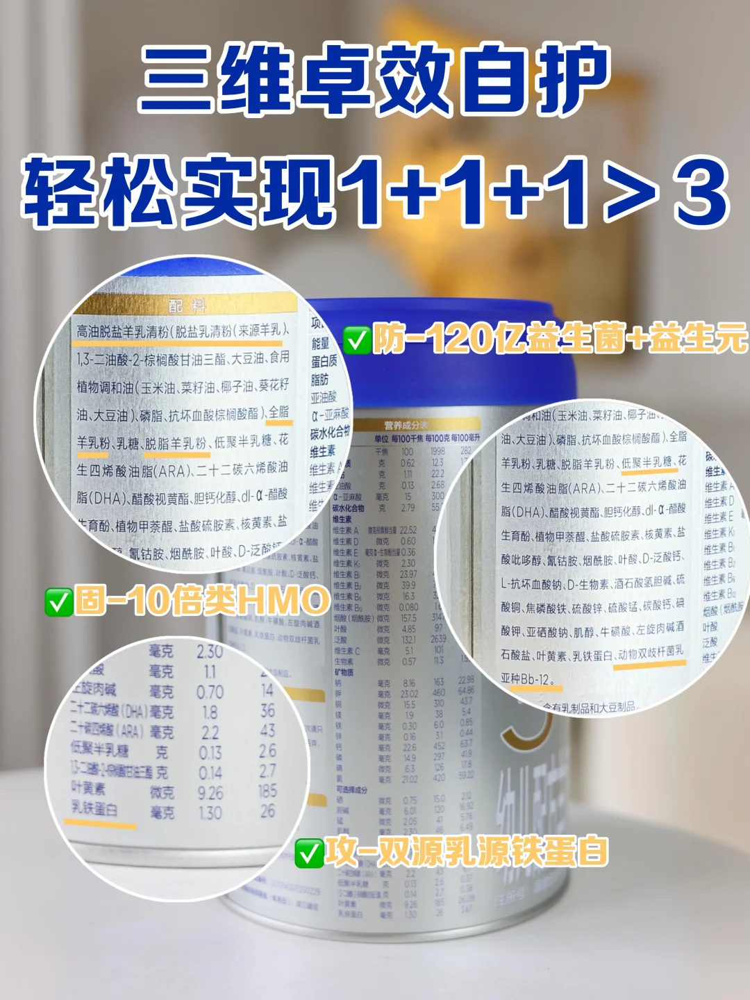 ⚠最让我看重的是它的三重自护力配方,它里面添加了双源乳铁蛋白,就像个小保镖时刻守护着宝宝,给宝宝筑起一道坚固的屏障!同时120亿益生菌和益生元强强联手,滋养有益菌扩大规模,稳住肚肚好状态。还有10倍类HMO,这可是接近天生营养的自护成分,三者加起来可不是简单叠加,攻防固三大维度带来1+1+1>3的效果,现在孩子就算在空调房里待久了,也很少闹不舒服了。