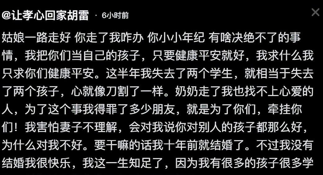 全网最懂事的女孩走了,投水自杀的。 这样的悲剧往往难以接受,小姑娘当年流下热泪,今天又有谁为你流泪? 两年前,著名残疾拾荒者胡雷在甘肃靖远做公益时,与受资助小女孩的一段互动视频,曾让无数人感动。视频中的女孩薛某某先将手中牛奶递给了胡雷,并为他插上吸管,但当她得知眼前的人就是她的资助人时,她忍不住泪流满面。 8月18日,这个懂事儿的小姑娘不幸离世。官方通报说,薛某某因辅导作业与家人发生矛盾并离家,遗体在家附近一水池内被发现。但是知情说,小姑娘母亲离家出走,父母常年在外打工,平日跟着爷爷奶奶,老人有重男轻女倾向,事发当天薛某某离家后并未寻找,而是带着孙子去吃席了,直到深夜才报的警。 这种说法存疑,重男轻女的家庭多了去了,也不构成自杀的理由,问题还是留守儿童心灵得不到守护,心中苦闷无处诉说,生活只有苦没有甜,绝望了。 关键是,这不是个例。