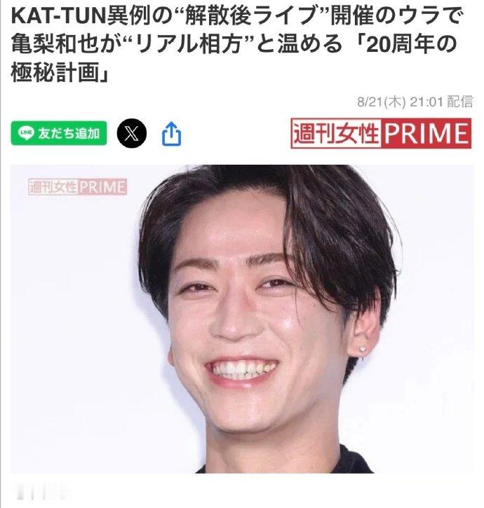 “最近,龟梨先生和赤西先生似乎频繁保持着联系。两人是从出道前就作为‘仁龟组合’拥有超高人气的‘传说中的搭档’。据说龟梨先生正和这位重要的伙伴赤西先生商量举办活动的事宜。只是,由于种种‘情况’叠加,该计划恐怕要到2026年以后才能实现。而且,这并非以加入KAT-TUN的形式,而是‘仅两人’开展的活动哦。”