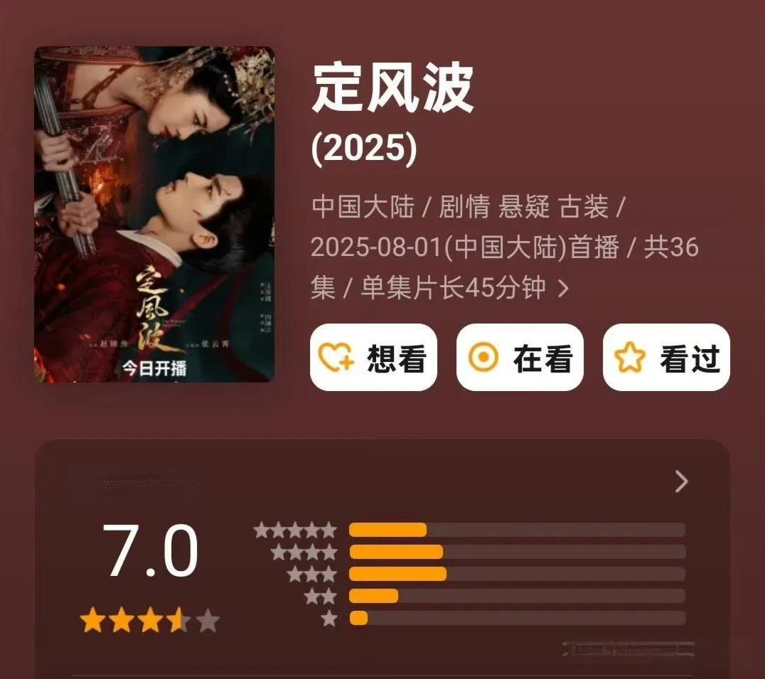 两部新剧豆瓣开分:1.杨幂、欧豪《生万物》7.5。 打分人数7.1万+。 分数还行吧,打分人数和现在的热度有点不匹配。 2.王星越、向涵之《定风波》7.0。 打分人数2.7万+。 分数可以,但播的效果一般,不过在近期的古装剧中,这部还是能看的!#头号创作者激励计划#