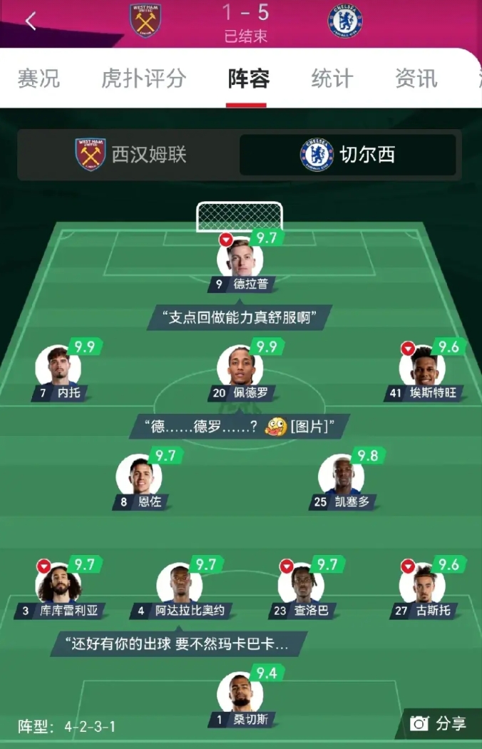 火力全开!难道这就是世俱杯冠军的含金量?这支车子真是强的可怕!一时不知道是老的切尔西太强了。还是波特的西汉姆太弱了。 感觉车子前场没了穆德里克和杰哥,都没人整节目了,一点乐子都没有了。还有就是缺谁谁尴尬,没帕尔默就是大胜,这下帕尔默首发的位置悬了。 没想到铁锤帮这赛季才打两轮就准备保级了啊,这教练换得是一个比一个菜啊。你说你为啥要赶走莫耶斯呢?从洛佩特吉再到波特,再这么搞真的要去英冠了。 看看波特能坚持到10月底不?我估计这赛季英超第一个下课的主教练就是波特。