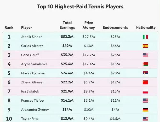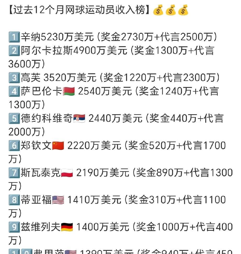 过去12个月网球选手收入榜出炉,郑钦文上榜top10! 排名第一的辛纳,收入52