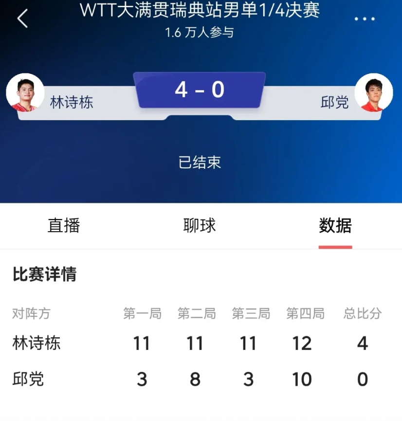 本场比赛,林诗栋将自己超强的个人实力展现的淋漓尽致,值得一提的是,林诗栋在第一局和第三局中都只让对手得到了3分,总而言之本场比赛林诗栋赢得比较轻松。
