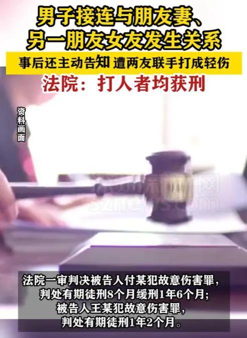 “关系太乱了!”甘肃宕昌,一男子与好友妻子偷偷发生关系,事后还将此事告知另一位朋友炫耀。朋友考虑到三人之间的关系并未戳破,谁知一个月后,男子就与朋友的女朋友发生了关系。两位好友得知后气愤不已,联手殴打男子,导致对方全身多处受伤。男子事后拒绝调解,将两名好友告上法院。法院的判决结果令人气愤! 2022年,赵某与付某因一场聚会相识。两人迅速成为朋友,随后付某将好友王某引荐给赵某,三人由此频繁往来,友谊日渐深厚。他们常到彼此家中做客。 那个时候,付某与妻子已婚,王某正与女友热恋并同居。赵某本人也已结婚,各自拥有着看似稳定的生活。赵某相貌英俊,风趣幽默,言谈颇具吸引力。 与付某和王某相比,赵某私下里还结识了付某的妻子和王某的女友。他与她们保持着密切联系,在三人相识的两年时间里,赵某持续私下与两位朋友的伴侣保持着不为人知的联系,这份友谊的根基正在悄然动摇。 2024年11月,赵某利用与付某的朋友关系,趁付某不在家时,偷偷约出付某的妻子。他与付某妻子发生了不正当关系。 事发之后,赵某对此事毫无愧疚之意。他甚至将与付某妻子发生关系一事告诉了王某,似乎将此视为一种个人“成就”。 王某得知此事后,内心复杂挣扎。他为维系与赵某的友谊,选择了暂时隐忍,并劝赵某尽快断绝这种不当关系,希望他能悬崖勒马。 然而,赵某并未听从劝告,行径反而变本加厉。仅仅一个月后,他再次与王某的女友也发生了关系,彻底突破了朋友间的道德底线。 几天后,王某知晓了赵某与自己女友的事情,王某此前积压的愤怒瞬间爆发,他感觉自己受到了彻底的羞辱。他当场质问赵某,要求其给出解释。 赵某见事情败露,自知无法抵赖。他当场下跪认错,苦苦乞求王某的原谅,姿态卑微,王某怒不可遏,情绪失控。他上前扇了赵某嘴巴两下,接着在其左大胯或胯部踢了两三脚,又用膝盖顶撞了赵某的后背两下。 王某随后将赵某的背叛行为告知了付某。付某闻讯后同样无法忍受,愤怒至极,立即与王某一同驾车找到赵某再次对峙。 在对峙过程中,赵某否认了与付某妻子发生过关系。付某随即从车后备箱取出一根棒球棒,对着赵某的胸口、背部等部位接连挥打。 王某也再次动手,扇了赵某耳光并踢踹他几脚。在被付某和王某驾车带走途中,赵某设法拨打了报警电话求救,警方迅速响应,在路上截停三人,并将他们带回派出所接受调查。 警方验伤后确认,赵某全身多处受伤,伤情鉴定结果均为轻伤一级,为案件定性提供了法律依据,由于王某和付某的行为已构成故意伤害罪,且赵某坚持要起诉二人,警方最终放弃了调解,案件进入司法程序。 当地检察院依法对付某和王某提起了公诉。法院经审理,确认两名被告人的行为已构成故意伤害罪,公诉机关的指控成立,付某和王某到案后均如实供述了罪行,对违法行为供认不讳,并自愿认罪认罚,展现出配合态度。 两人均表示愿意对赵某进行赔偿,并希望能够获得赵某的谅解,以期获得从轻处罚。法院综合考虑后,决定对二人从轻处罚,赵某坚决不接受任何赔偿,并且明确表示不谅解王某。赵某的态度直接影响了法院的量刑。 法院因此判断王某的情况不适用缓刑,因为未能取得受害人的谅解。最终判决结果随即公布,付某犯故意伤害罪,被判处有期徒刑8个月,缓刑1年6个月。王某犯故意伤害罪,被判处有期徒刑1年2个月。 此案公布后,立即在社会上引发了广泛热议,许多人感慨交友不慎,引狼入室,对赵某的行为表示强烈谴责,也有不少网友认为,赵某作为事件的直接引发者,这样的行为也应受到惩罚。 赵某的行为虽然在道德层面令人不齿,遭受社会谴责,但因为并未构成刑事犯罪,无法通过刑法惩处,赵某的行为并非无需承担责任。其妻子在离婚时,可基于赵某的过错,依法向其要求民事赔偿,保障自身权益。 付某作为婚姻的受害者,同样有权依据相关规定,向自己的妻子追究相应的民事责任。王某与女友虽是情侣,也可参照此规定主张权益。 这个案子深刻警示世人,无论面对何种背叛与激愤,私自采取暴力报复行为都将跨越法律红线,触犯法律。愤怒不能成为违法行径的理由。 在现代社会,即便面对极端的道德挑衅,公民也应回归法律框架寻求解决,而非诉诸以暴制暴。否则,施暴者终将付出法律代价。 对此,你怎么看? 信源:红星新闻——2025-08-21《一男子接连与两名好友对象发生关系好友得知后将其打伤,犯故意伤害罪均获刑》
