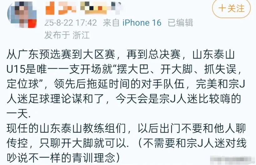 输急眼了?也不知是眼红,还是嫉妒,真不知道为什么总有人人去贬低鲁能青训。 在刚刚结束的中青赛决赛中,山东泰山U15队3:0大胜广州铭途,蝉联本届赛事冠军,但关于本场比赛,赛后却有“青训专业人士”直言泰山U15踢得非常难看,只会蹲坑防守摆大巴,只会身体对抗开大脚,毫无高超的战术可言…… 难道赢球不是硬道理吗?一切战术设计不都是为了获得比赛的胜利吗?再说泰山梯队并非没有传控的能力,只是会选择更合适的战术去赢球,连续四次问鼎这项赛事冠军,还再一直质疑,简直是荒唐至极!