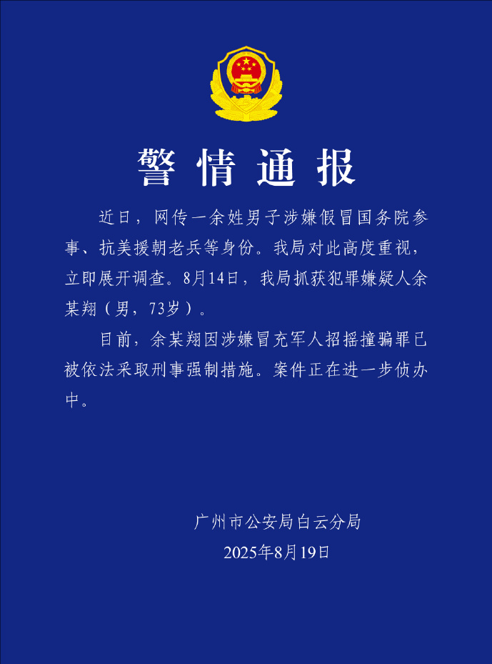 深圳市公安局南山分局、广州市公安局白云分局同日内分别发布警情通报,对此前网络盛传的阮某平和余鹏翔假冒院士、将军、参事等身份进行调查,现初步查明他们利用假冒的特殊身份非法获利,并多次假冒特殊身份参加社会活动,现被依法刑事拘留,案件正在进一步侦办中。