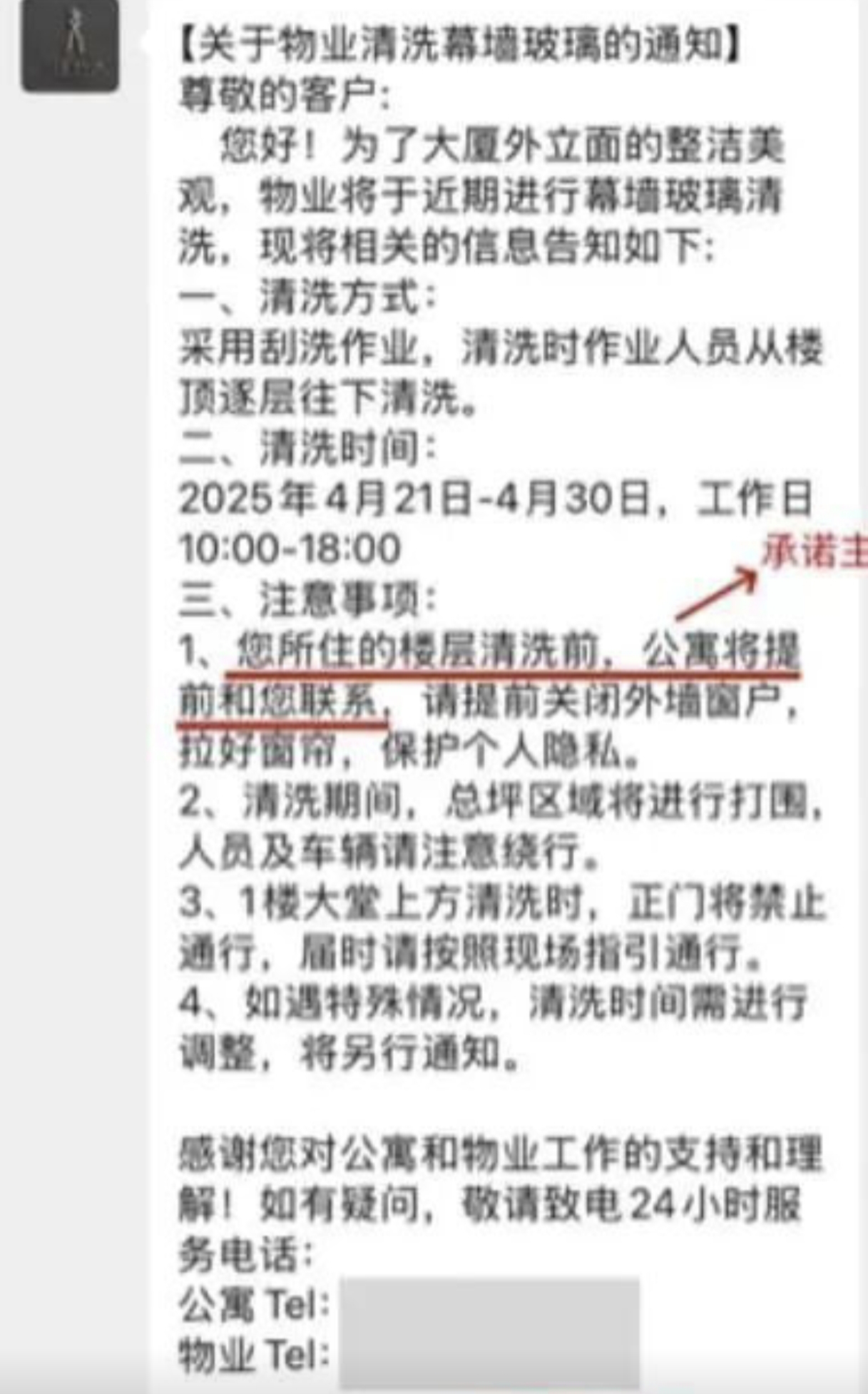 一万块一个月的公寓连隐私都保不住?妻子裸睡被看光 4月25号上午,成都程先生正在客厅办公,卧室里突然传来妻子尖叫。冲进去一看,2个清洗外墙的男工人正悬在几十层高的窗外,隔着玻璃跟他妻子对上眼了,那会他妻子正裸着睡觉。 这事之前是有过说法的。4月18号,公寓管家就私信他妻子,说21号到30号要清洗外墙,到时候会提前发消息提醒拉窗帘。21号那天,程先生还特意在公寓服务群里强调,到他们这层务必提前通知,私信、群里都得说,管家和前台都回了“好的”。可真到了25号,啥通知都没有,工人直接就到窗外了。 程先生气得不行:“我们在自己家睡觉,难道还得全副武装?”。他妻子从那之后就没缓过来,天天做噩梦,情绪也不对劲,连门都不愿出,去医院查说是焦虑抑郁,还睡不好。 公寓方呢?除了事发头几天拎着水果来道了个歉,之后3个月压根没管过。直到8月租房合同快到期了,才说有“解决方案”:要是续租,每月少600块租金。程先生直接火了:“我们月租一万,差这600块?这不是往伤口上撒盐吗!”。公寓前台还嘴硬说“外面有幕墙和灯光,不一定看得清”。其实玻璃是透明的。 程先生还说,这公寓不是头回这样了。去年9月就有保洁没打招呼就闯进房间打扫,当时他们明明说了“等我们回家再弄”,结果回去就见房门开着,保洁在屋里转悠。 这哪是高端公寓该有的样子?承诺的提前通知不算数,出了事就装样子道歉,补救还这么糊弄。程先生现在就想要个公开道歉,再给合理赔偿,这不光是为他妻子讨公道,也是想提醒大家不管房子租得多贵,要是连隐私都保不住,住着也不踏实。 他妻子到现在还在问:在自己家里裸睡有错吗?