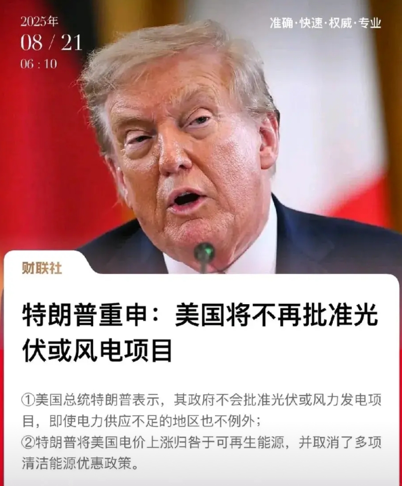 懂王为什么反对光伏和风能呢? 其实原因很简单,美元和石油挂钩,但是美元和新能源却不是,新能源方面无论是技术还是应用目前话语权都在中国手里。 西方国家是最早提出新能源发展理念的,但是他们最初目的是为了限制像中国这类后发展国家的工业化,美其名曰保护环境,但没想到中国新能源发展速度太快了,掌握了新能源各方面的技术和原料,美国现在玩不过只好掀桌子了。