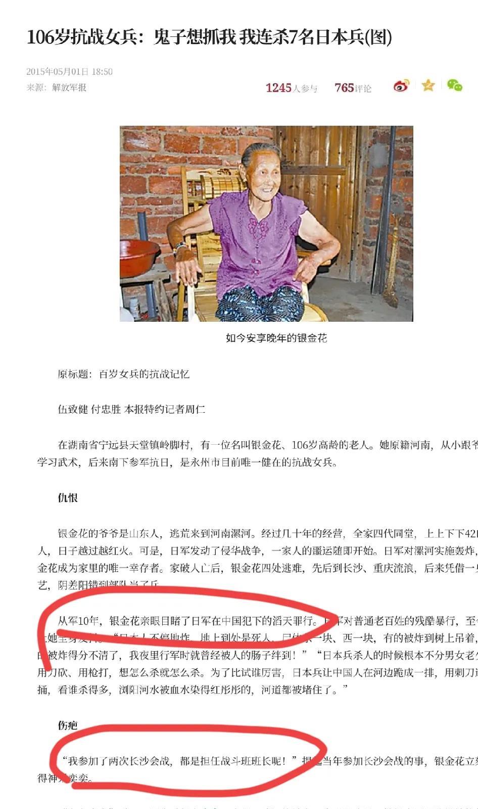 这长寿秘方,过于硬核,怕是再没人学得会了! 抗战女乒银金花老奶奶,已经一百多岁,曾经有记者好奇为什么这么长寿,她没有直接说出答案,给记者回忆了自己杀鬼子时的感想。或许她是暗示抗日战争阻击日本侵略者是长寿的秘诀。 参加过抗日战争,据说参加过两次长沙会战,多次扛着机关枪射杀日本人,这样的女英雄值得敬仰。 可是这样的“长寿秘诀”过于硬核,无法复制模仿了。