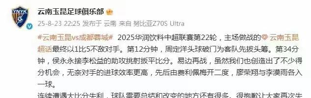 连续制造惨案,玉昆一周之内两度道歉,要想挽回颓势不但要观其言还要看其行! 如果说足协杯七球败于国安是因为少打一人,那么昨晚和蓉城的比赛则没有这方面的短板,而且他们在上半场就已经出现松动局面两球落后,下半场更是无还手之力,再丢三球,以1:5败北,要知道这可是他们的“魔鬼主场” ,多支球队在这里遭遇“滑铁卢”,如今却出现的惨败,俱乐部虽然两度发声向球迷道歉,但纸面上的诚恳只能表明一种态度,最终要看的好事成绩![作揖][作揖][作揖] #秋日领花茶#