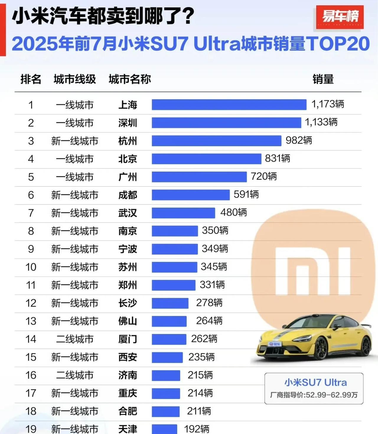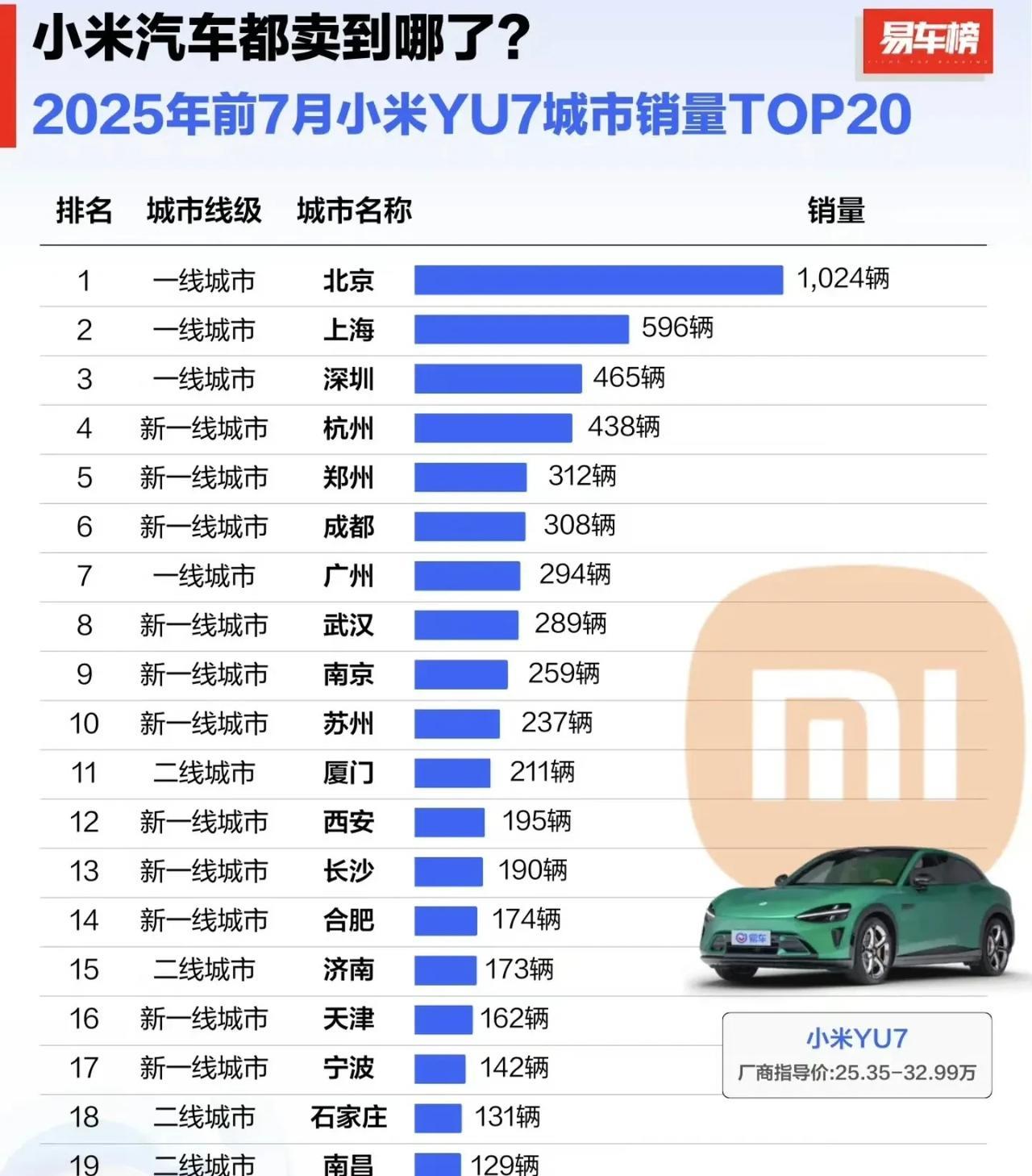小米三款汽车各大城市销量排名出来了,深圳、北京、杭州卖最好! 近日,易车网公布了今年前7个月小米SU7、小米YU7和小米 SU7 Ultra销量情况,其中小米SU7卖的最好的是杭州,小米YU7卖的最好的是北京,小米SU7 Ultra卖的最好的是上海,果然还是上海人有钱啊!
